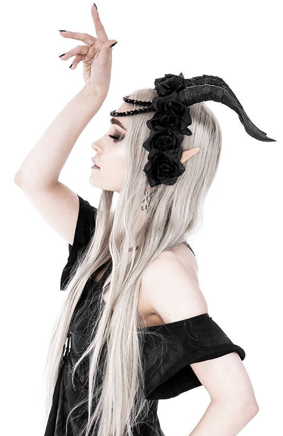 A gothic cosplay dream - goat horns, black blooming roses and two rows of draped black beads attached onto a wide covered headband. The horns are adorned with gorgeous ornate design details.