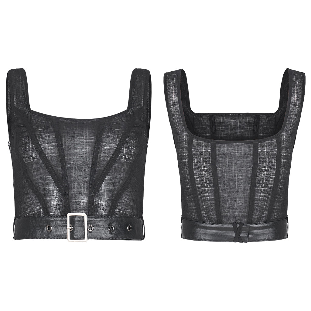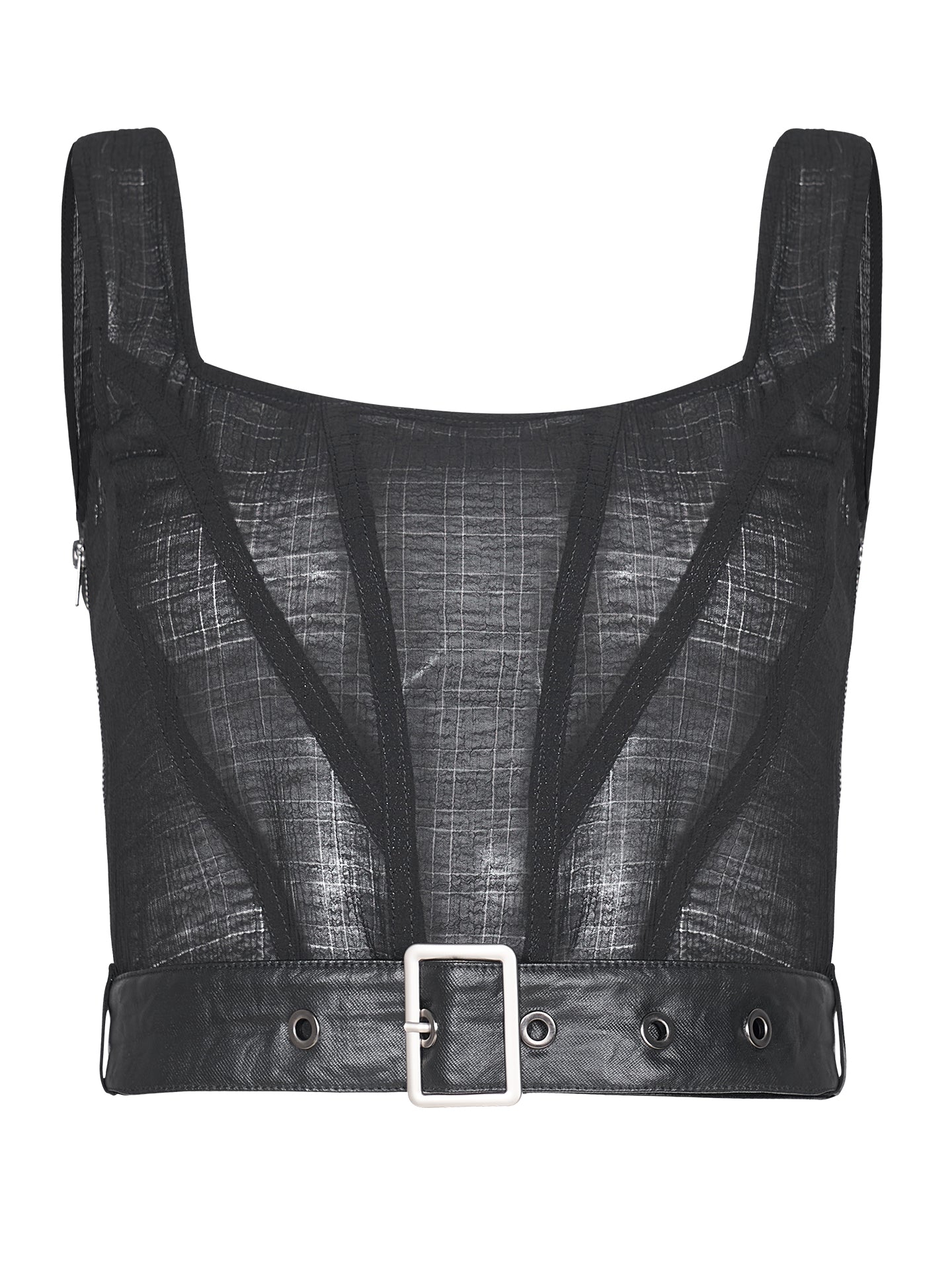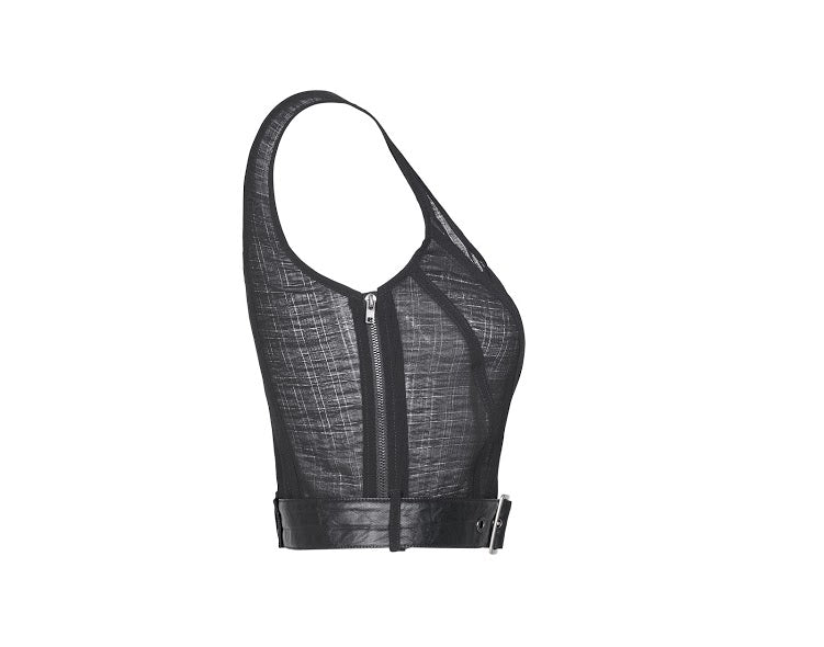 We love this stunning cropped tank top with faux leather belted hem and gorgeous structural design. Black, with a semi-sheer linen finish, side zipper and comfortable shoulder straps.