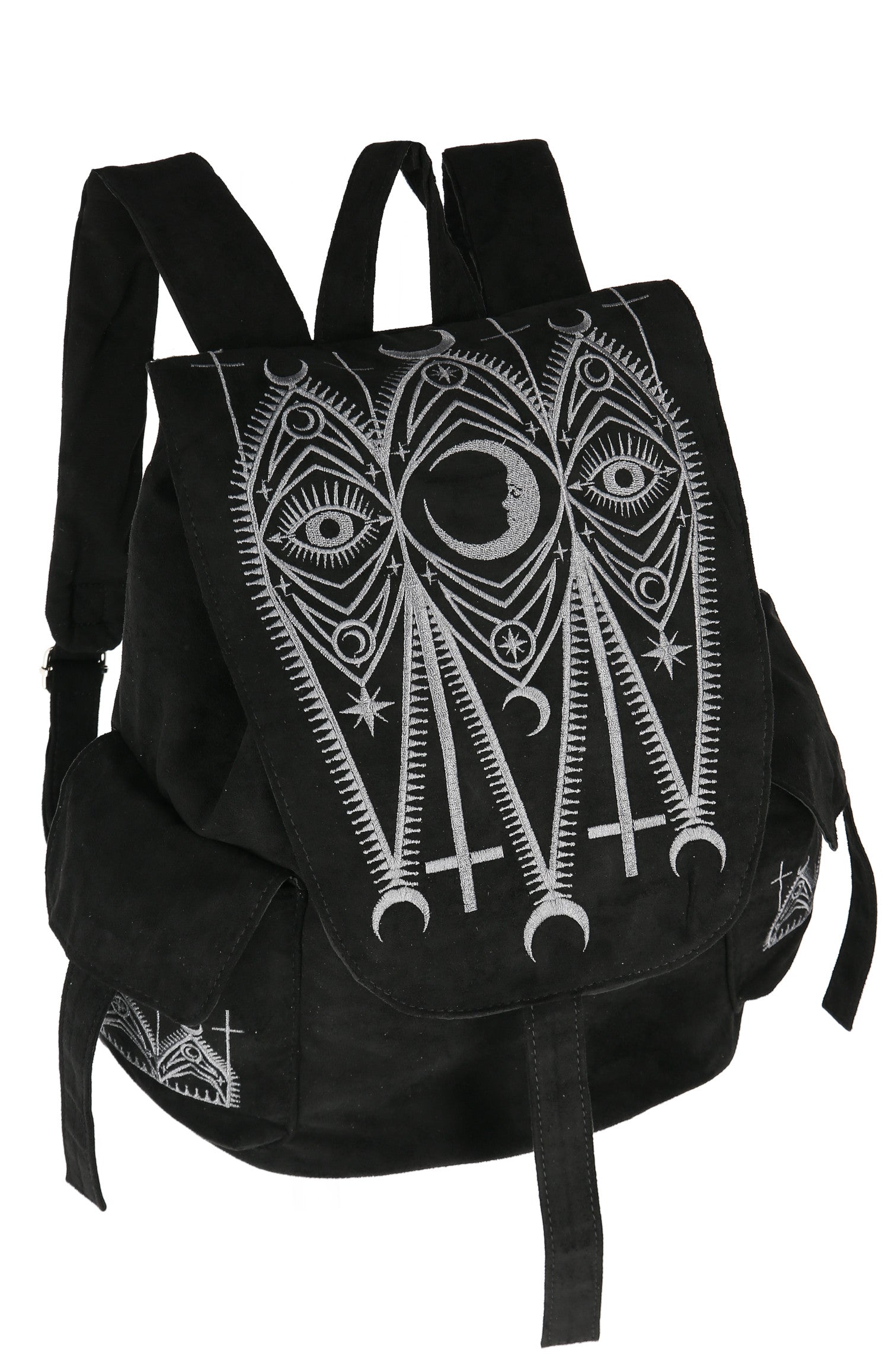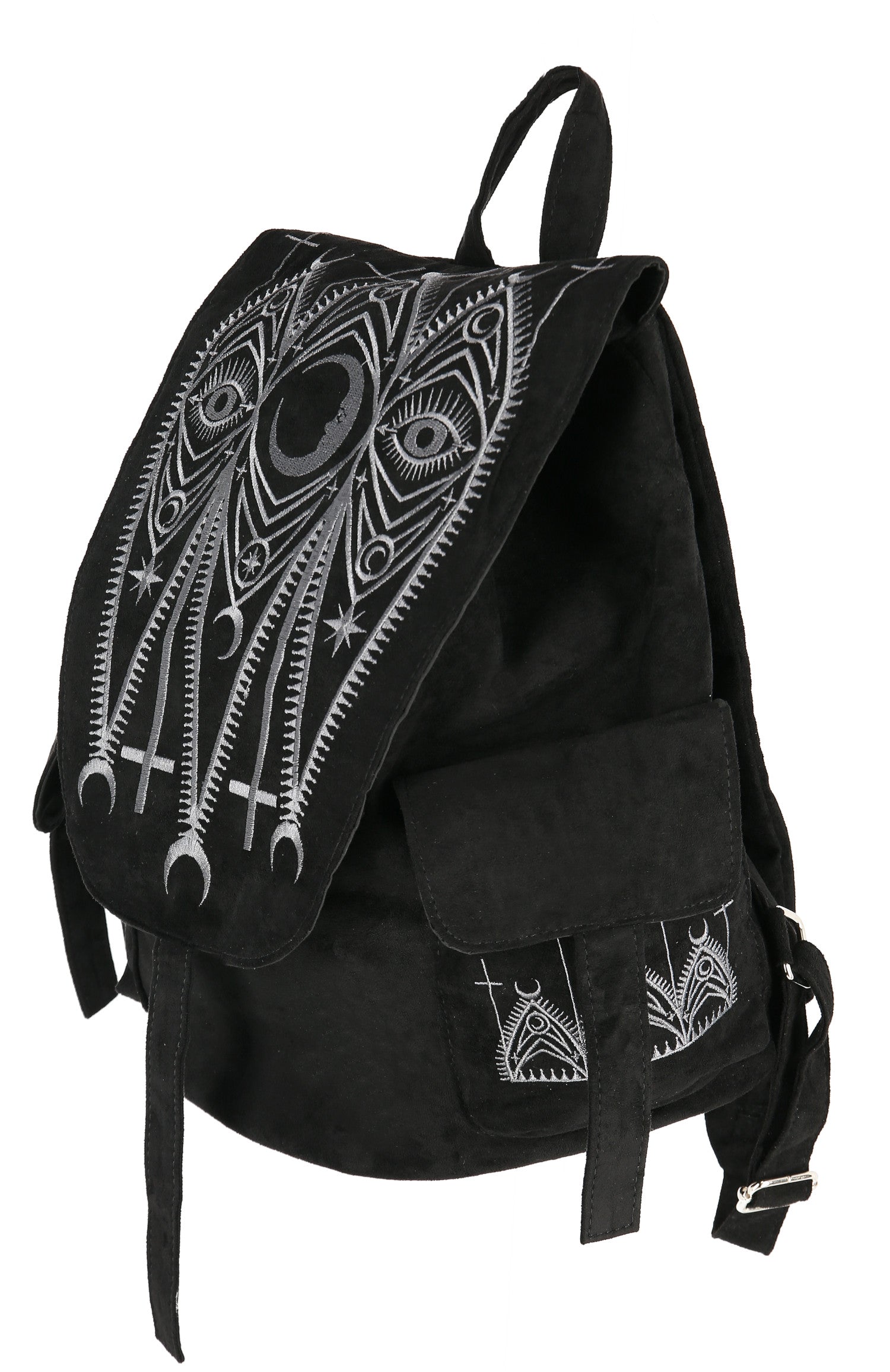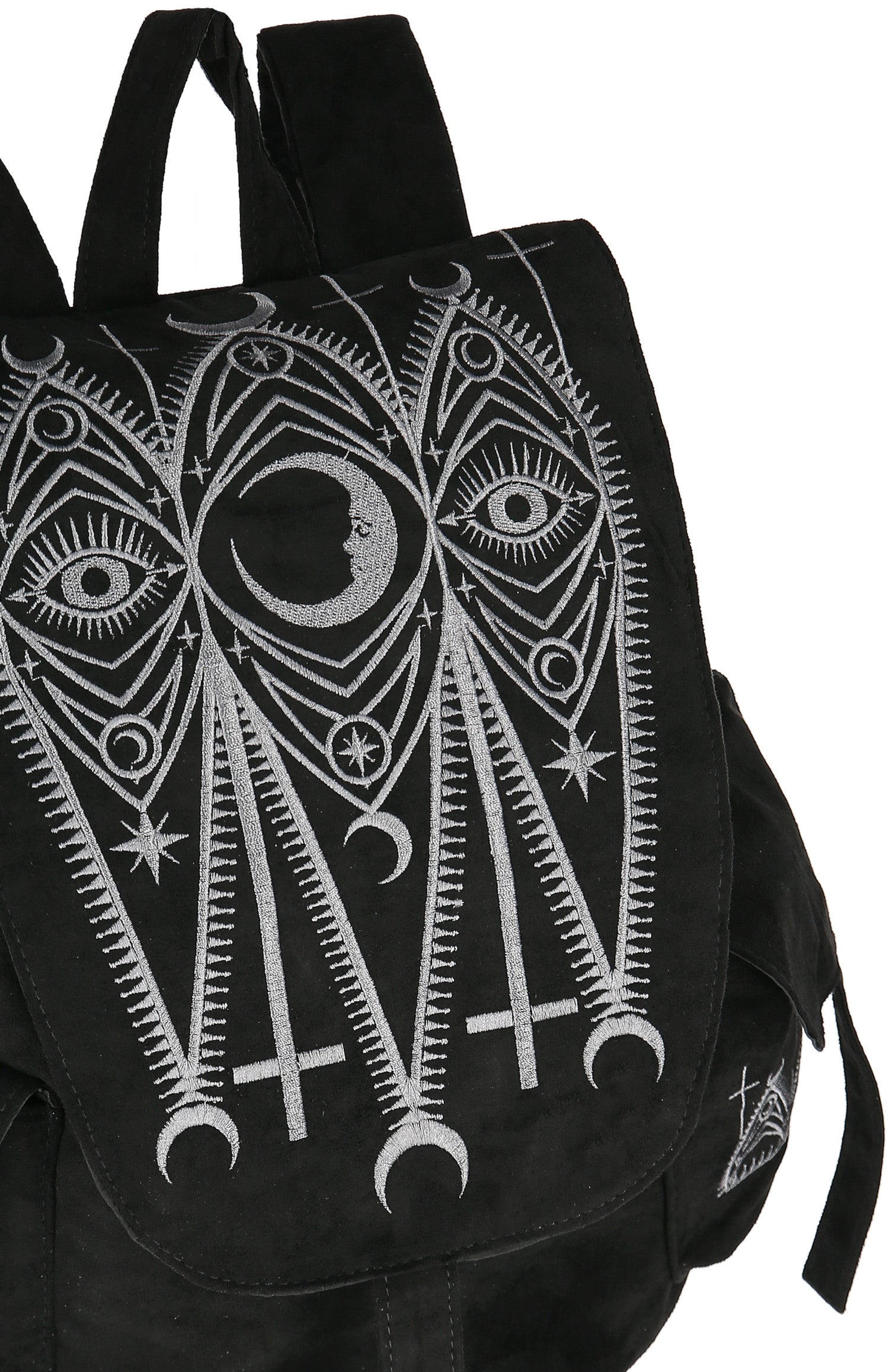 A stunning back pack adorned with ornate embroidery inspired by gothic architecture and moon phase patterns.