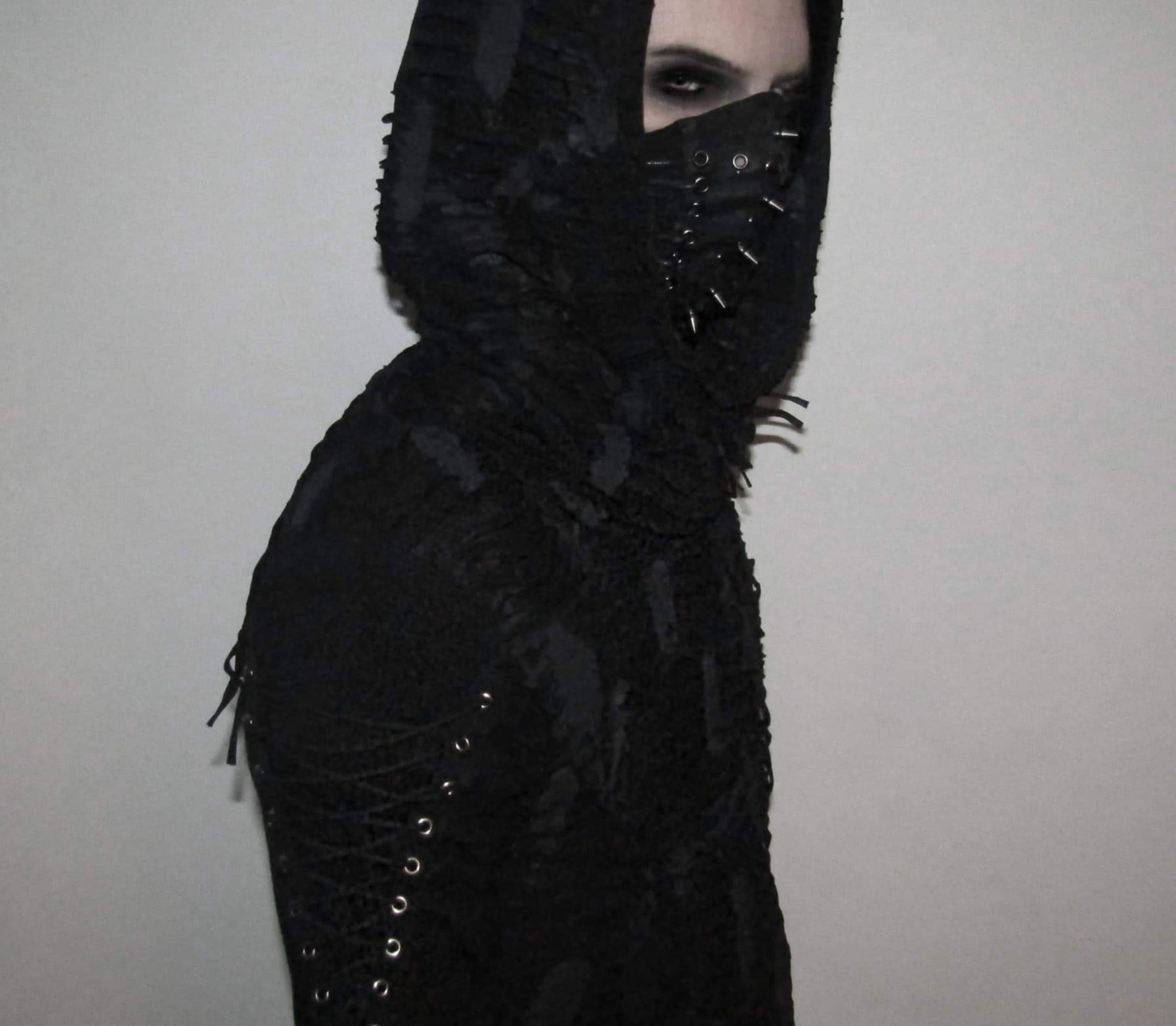 Black faux leather mouthguard with 2 snap fastening elasticated straps - features metal spike rivets, eyelets, and corset lacing to both sides, complete with branded metal D-rings.