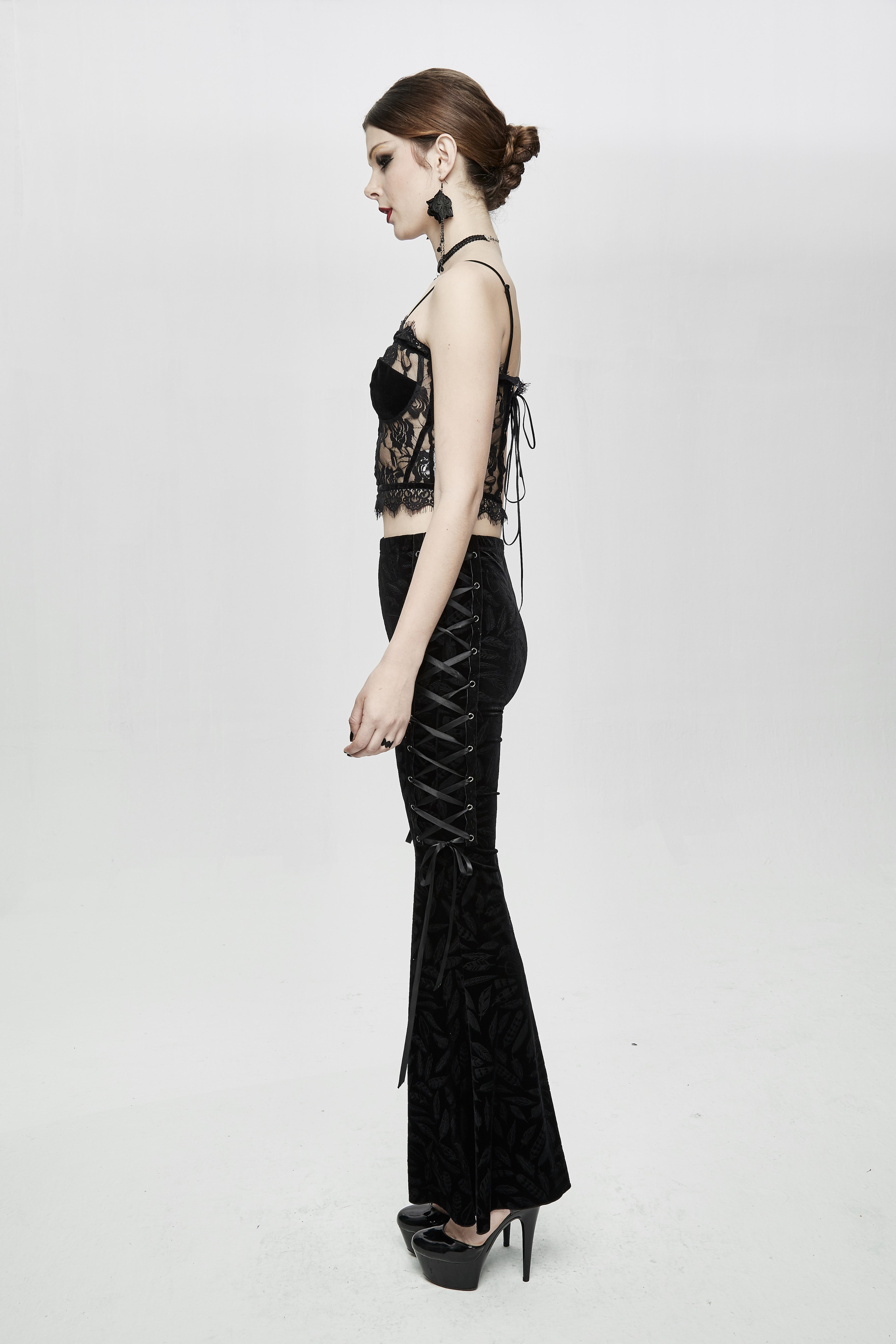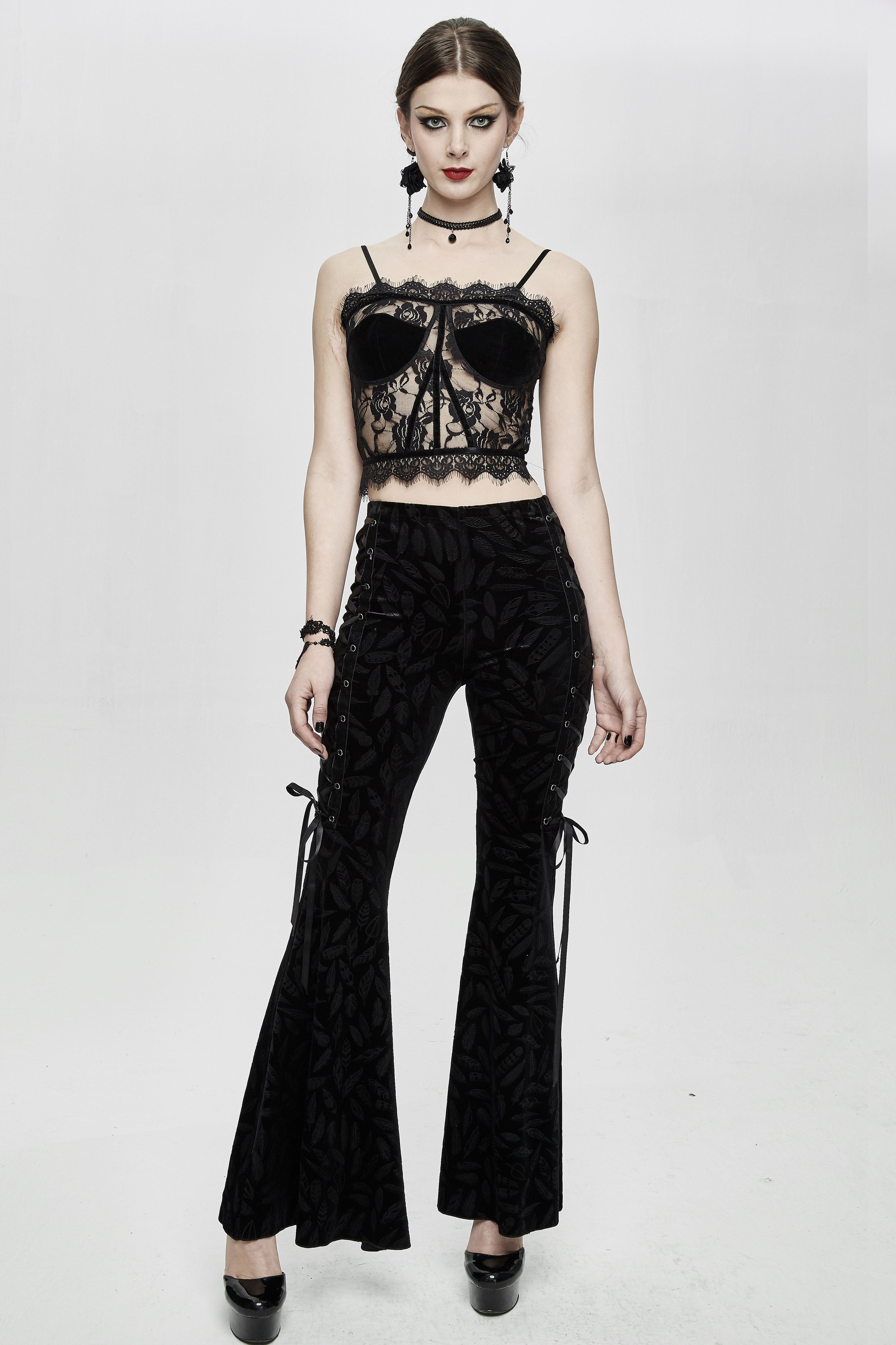 A beautiful lace cropped tank top, traditionally gothic with delicate shoulder straps and velvet chest pad coverage.