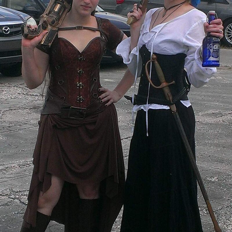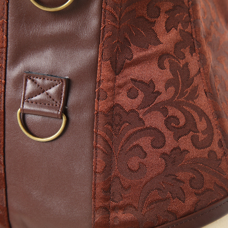 The gorgeous rich brown tones reach to the faux leather corset back-laced waist. A waist belt is also included.
