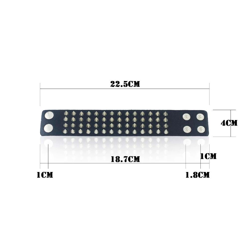 Black faux leather heavy metal clasp cuff wristband with four rows of spikes. A classic punk/metal accessory for any gender.