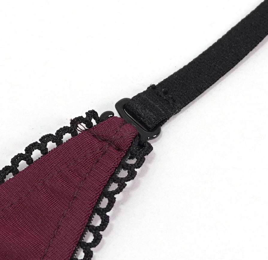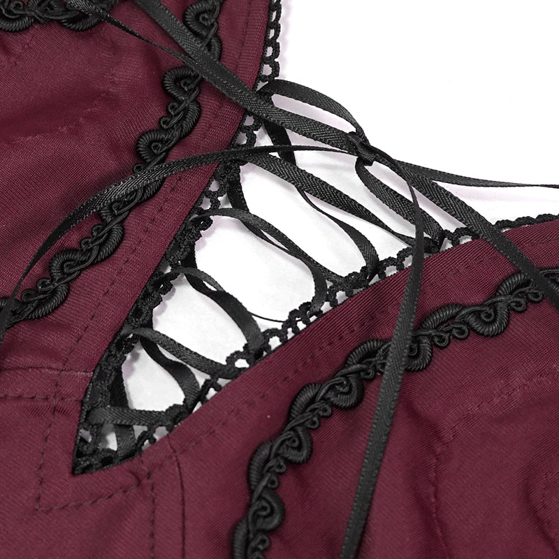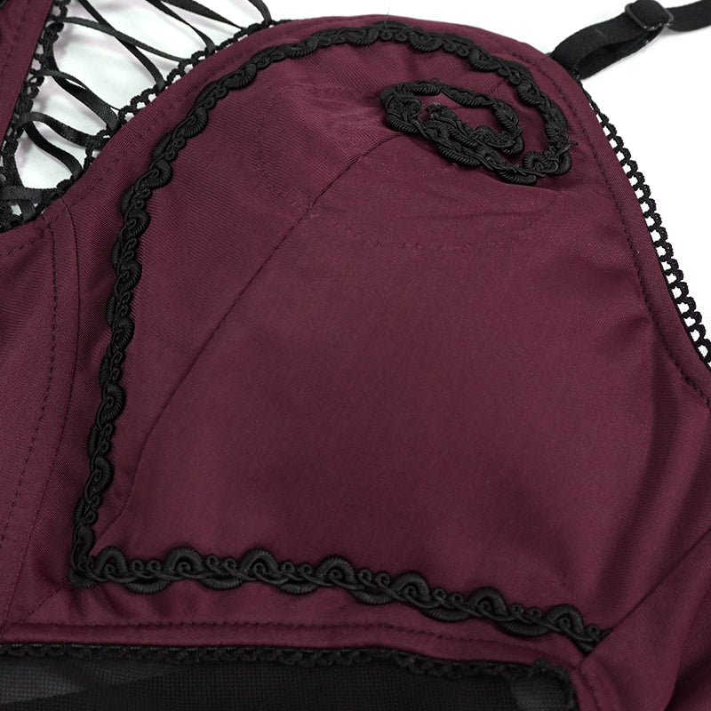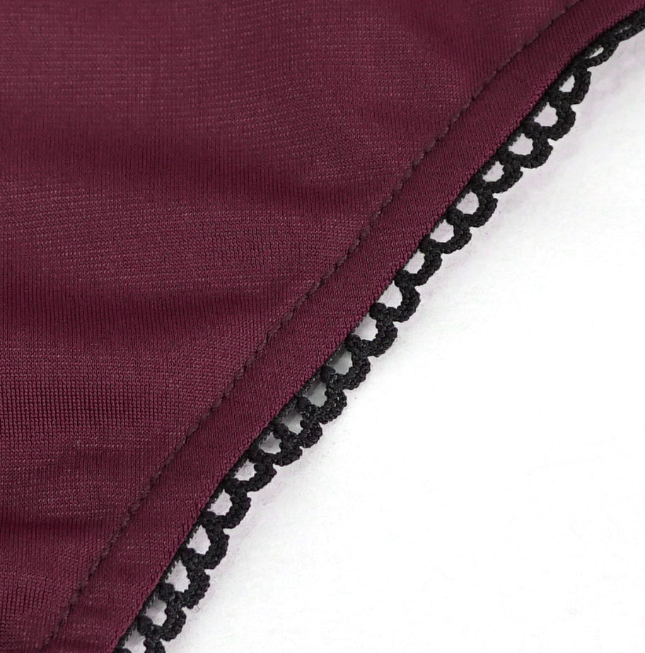 A stunning gothic one-piece bathing suit, with a gorgeous burgundy wine color and black trim.