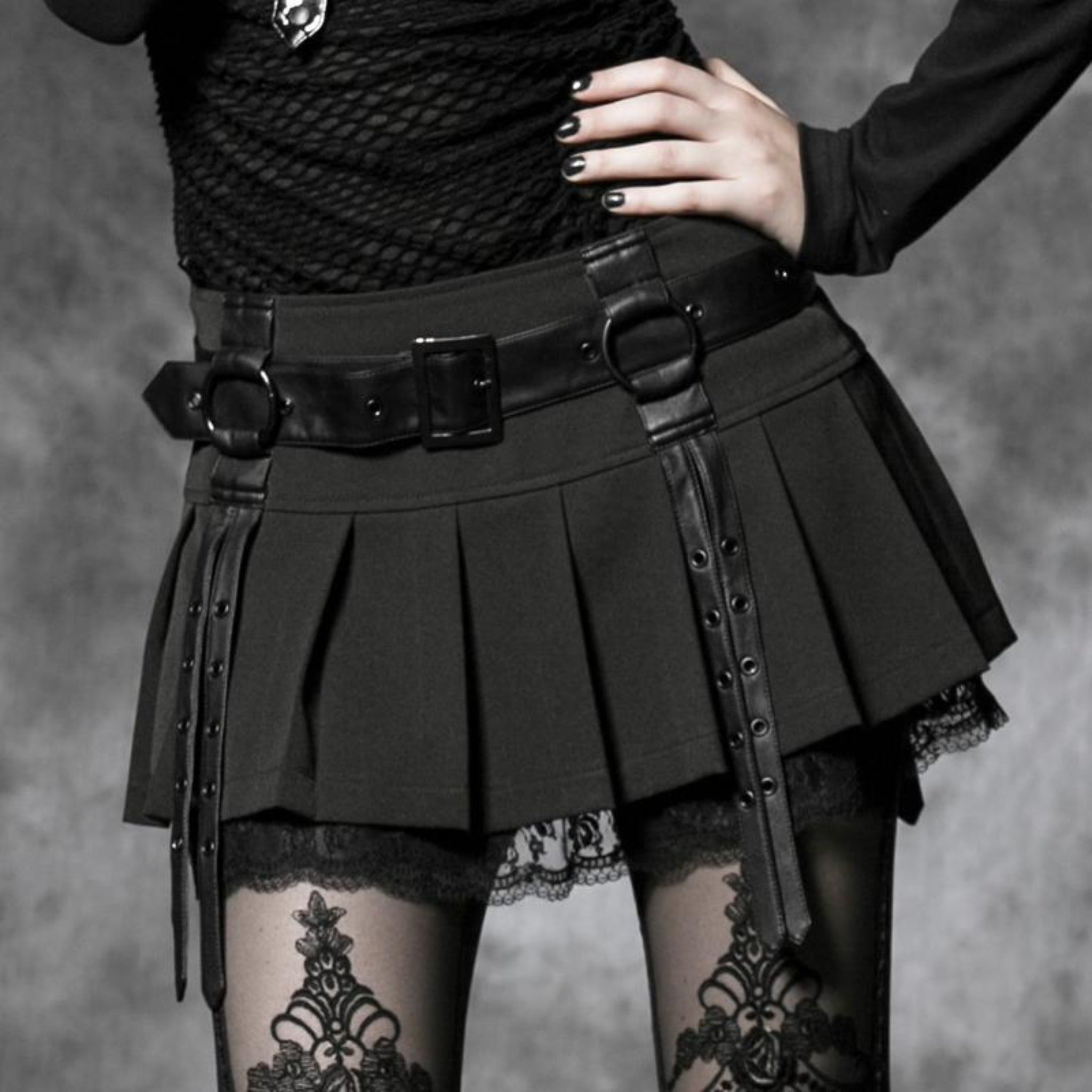 The cutest Gothic pleated mini skirt, with a visible black lacy underskirt, cool faux leather belt at the waist, and riveted harness straps.