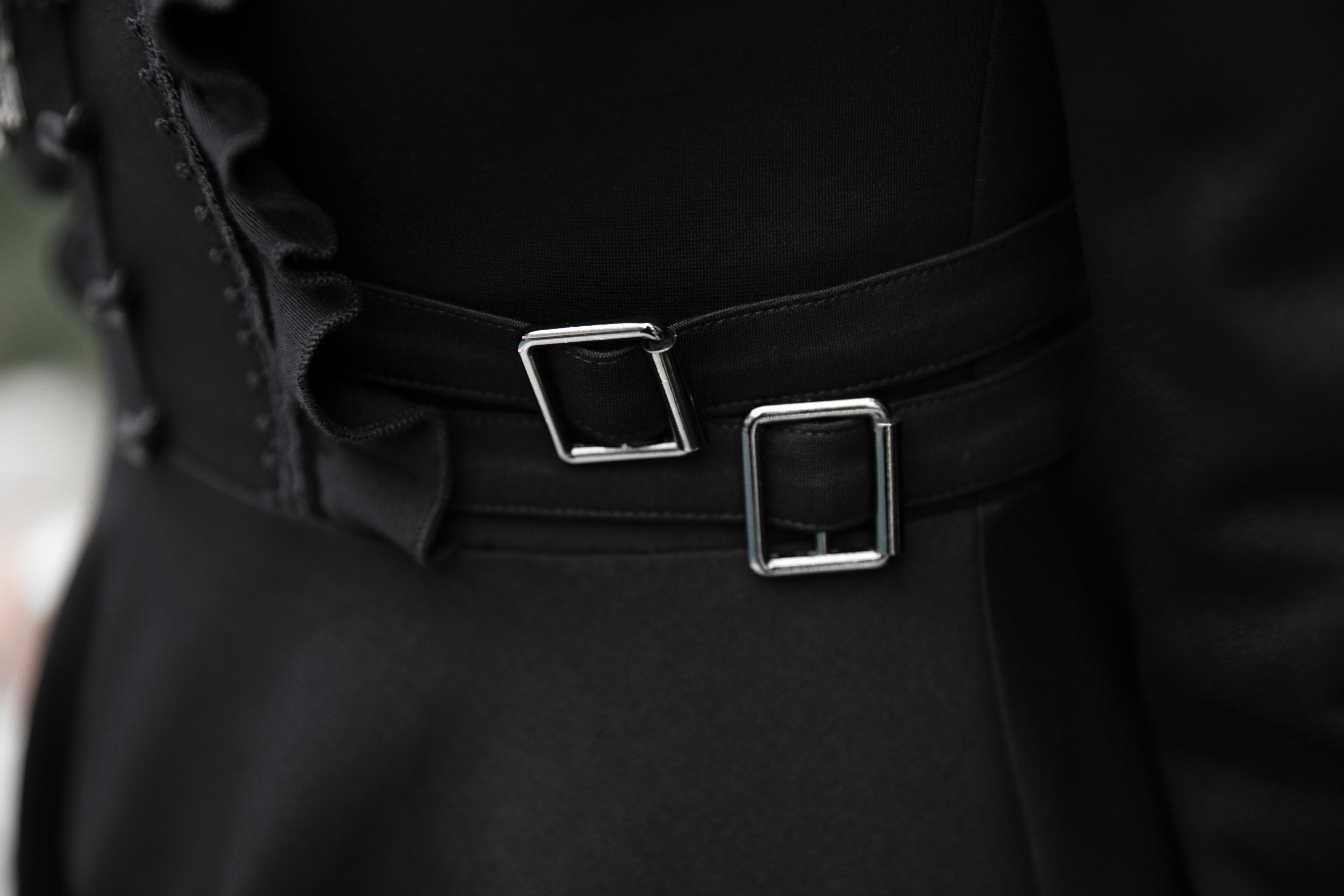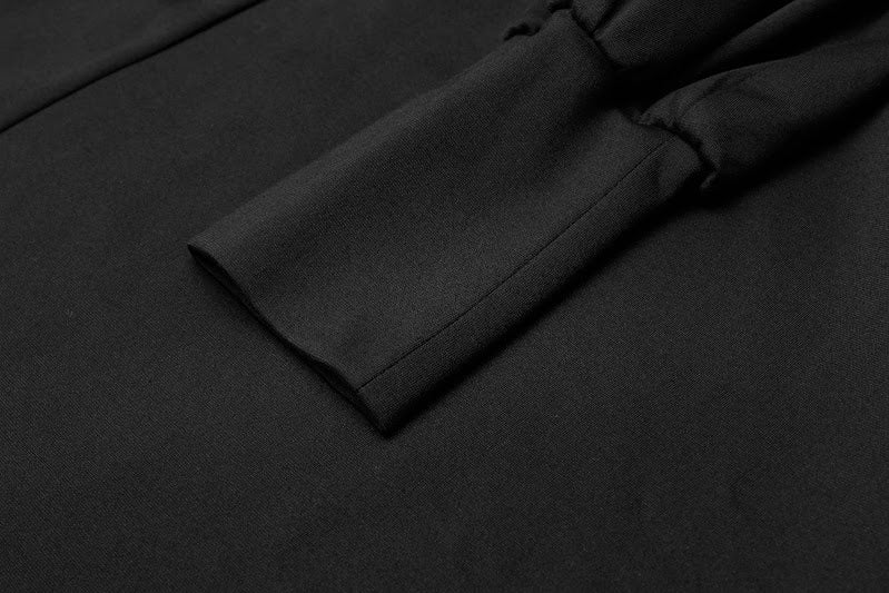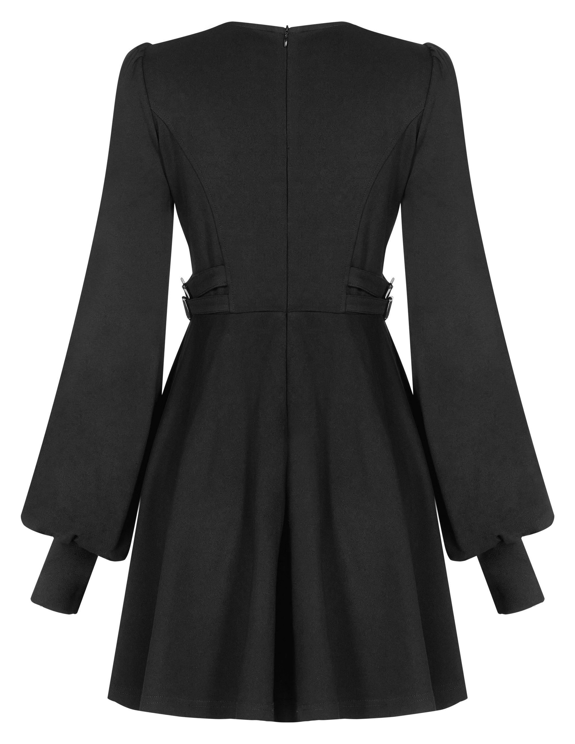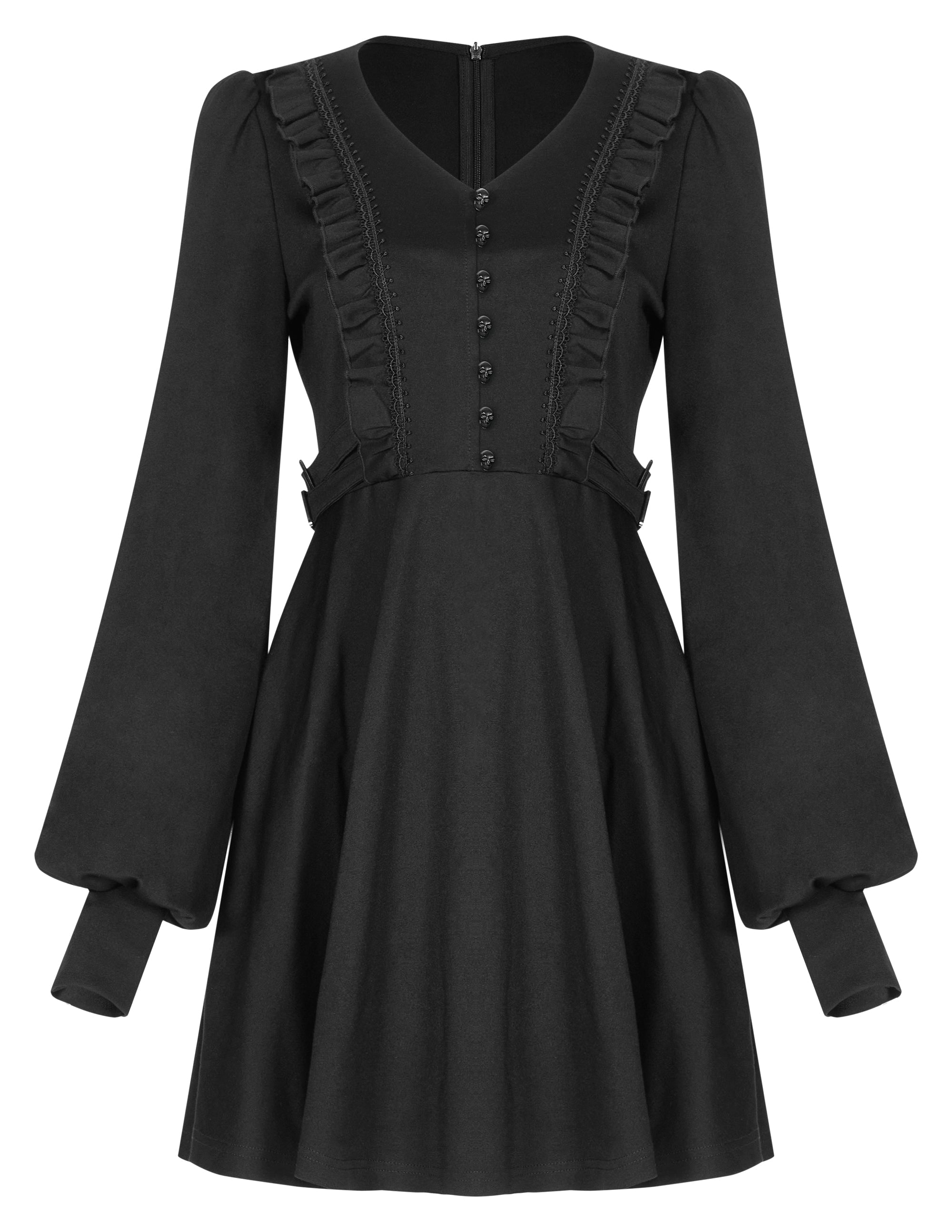 A gorgeous and timeless witchy dress with a v-neck button front, ruffled shoulders and long bell sleeves with tight stylish cuffs.