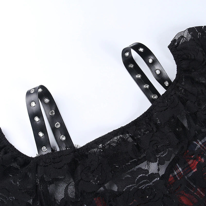 Specs: The front of the top has a lace up straps, with see through lace and a cutout at the collarbone.