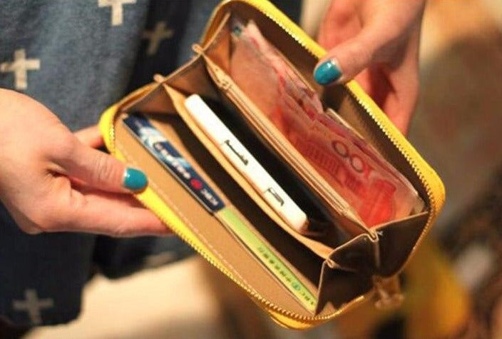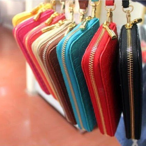 Lots of inside compartments, including credit card slots and one zip pocket for coins. Includes a detachable wrist strap.