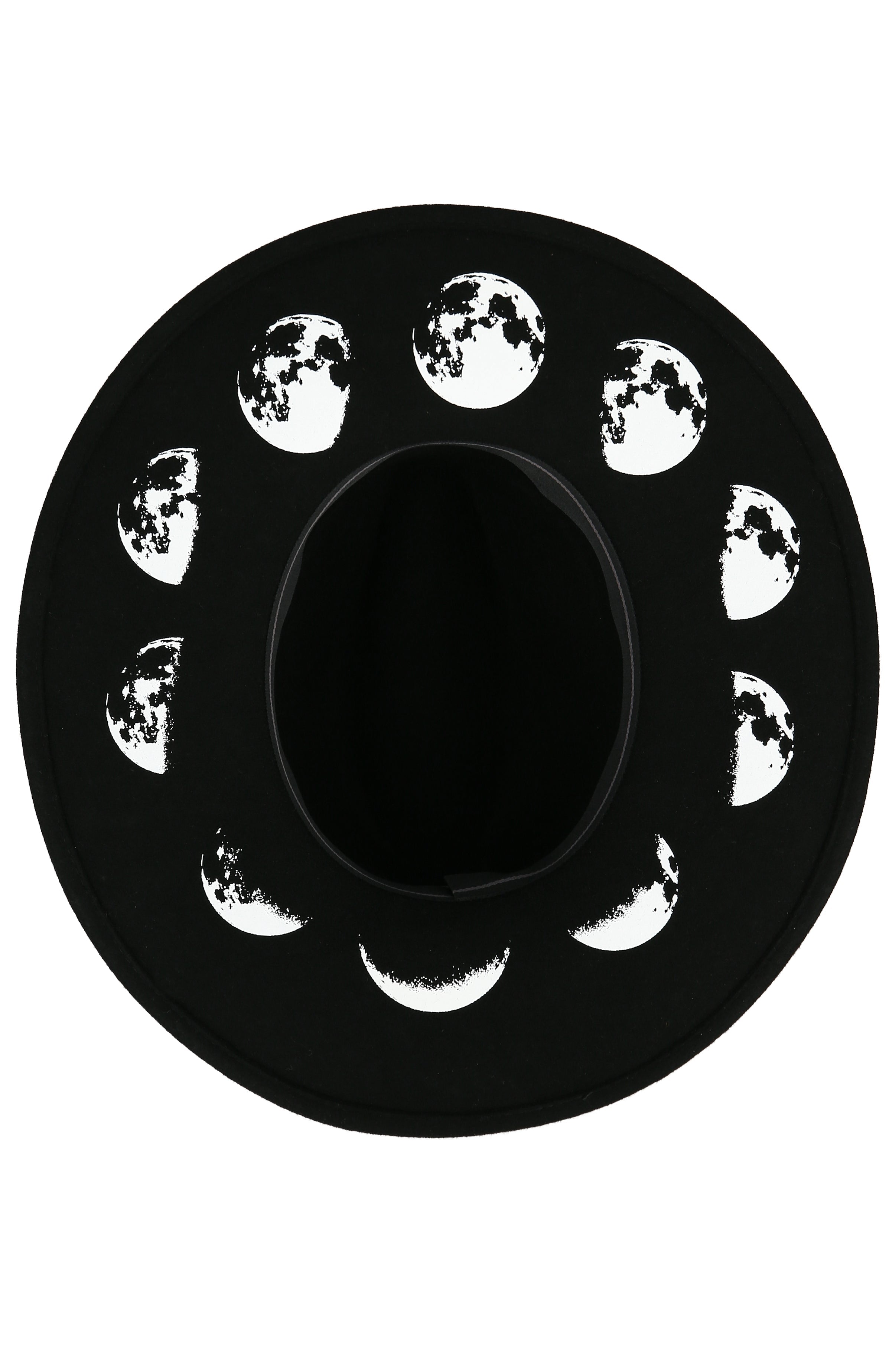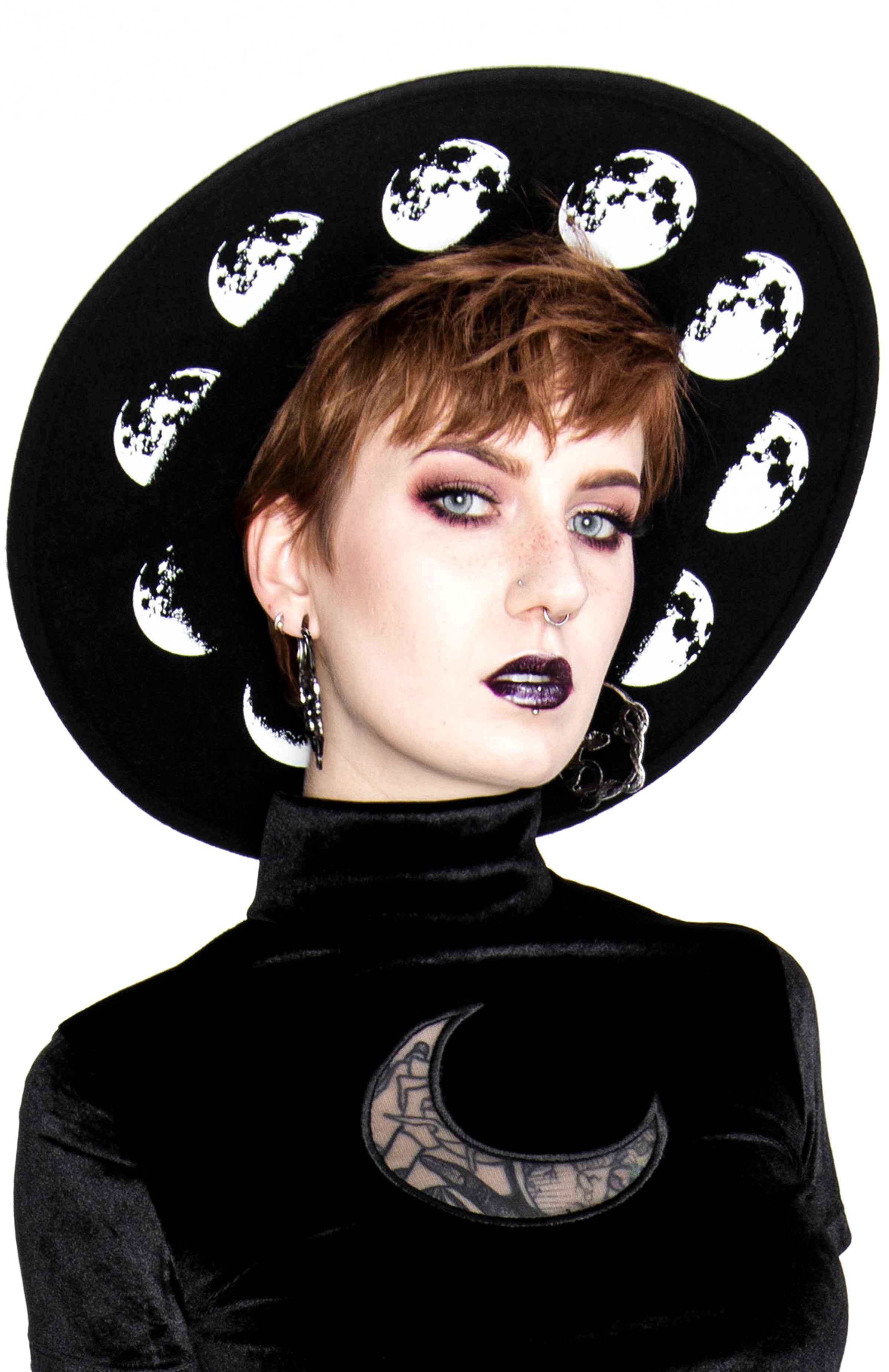 A sinister and stylish black gothic rock star hat with a stiff brim so it keeps it's shape. A beautiful moon design provides witchy, otherworldly vibes..