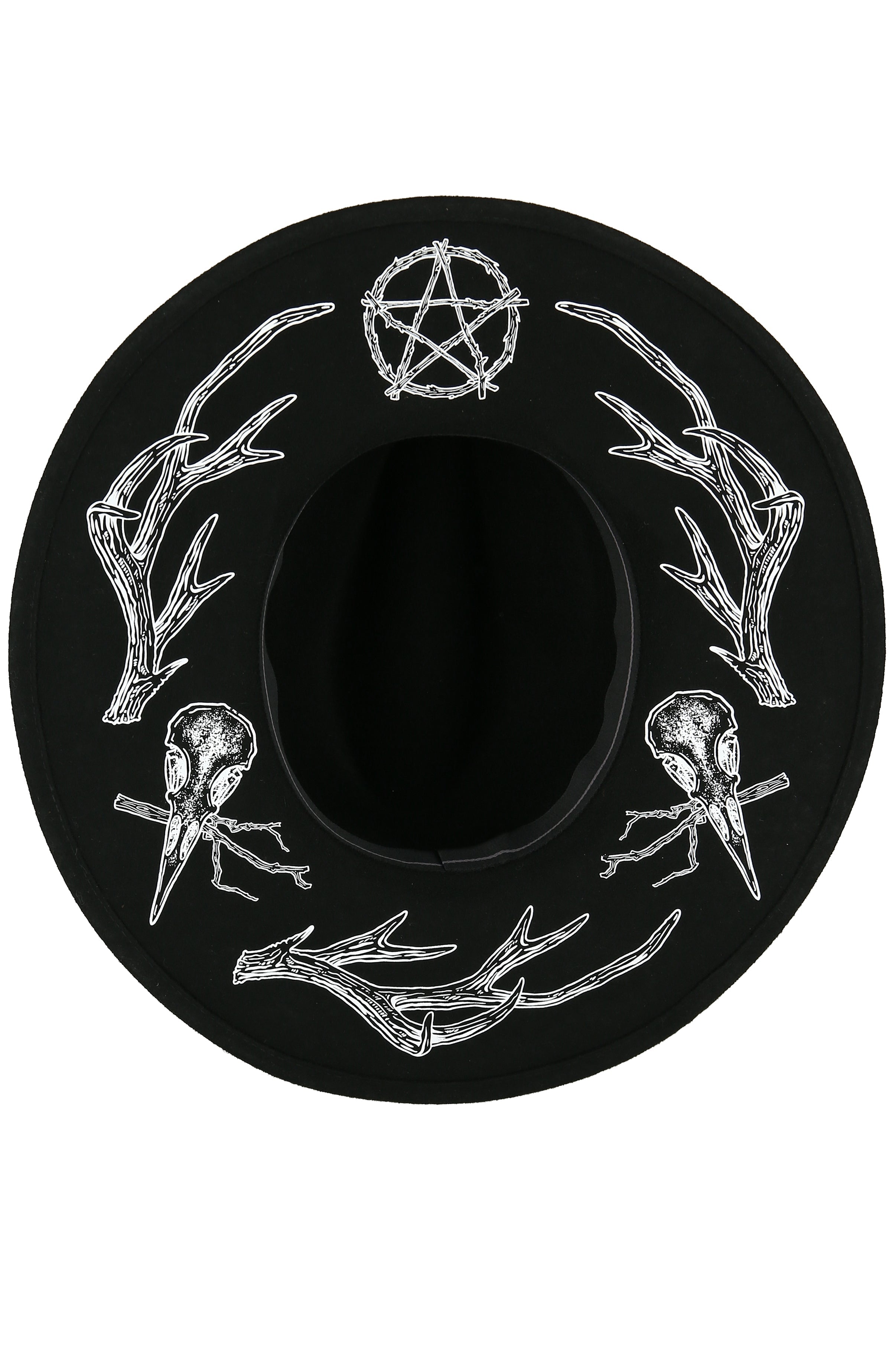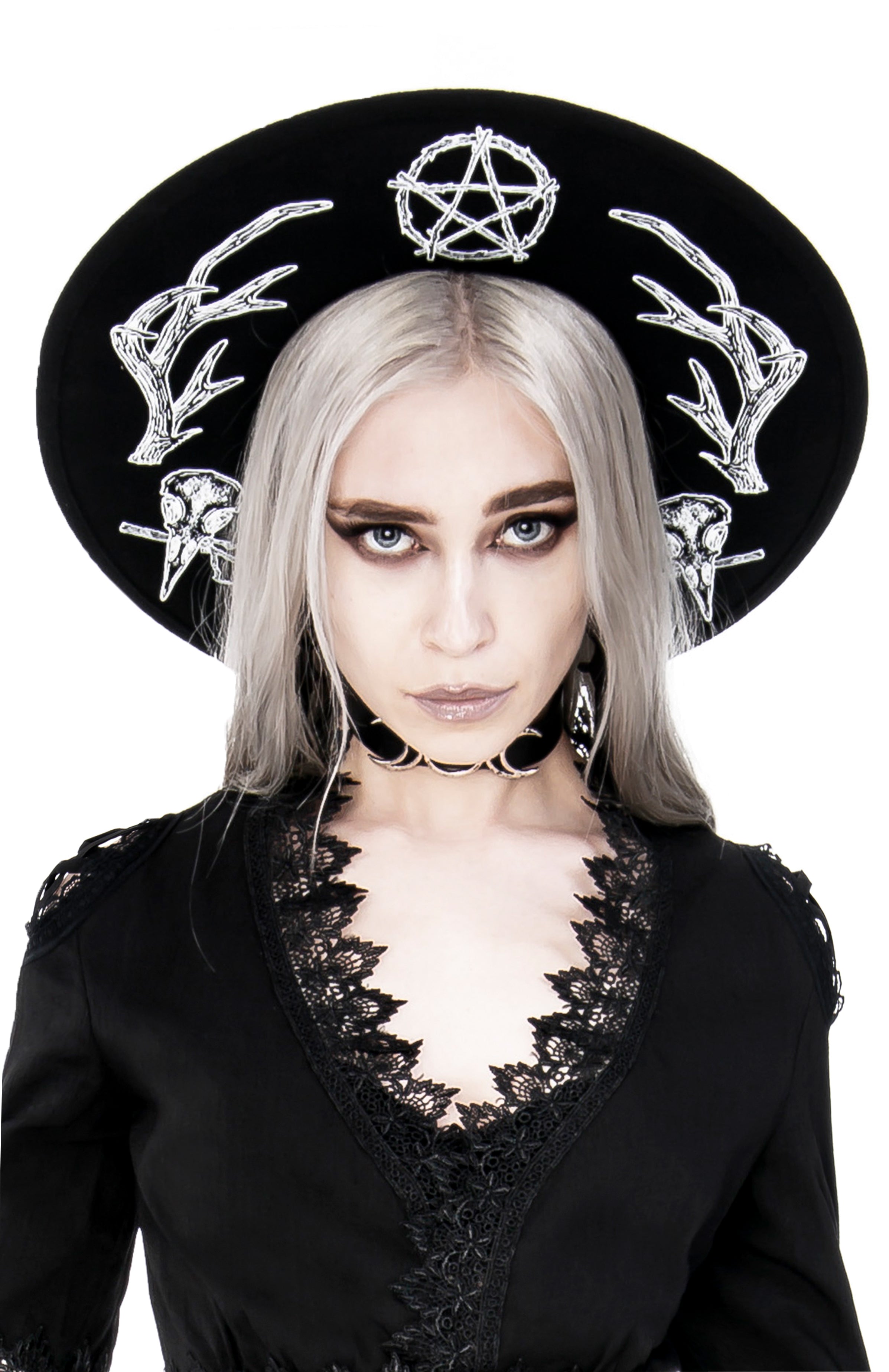 A sinister and stylish black gothic rock star hat with a stiff brim so it keeps it's shape. A beautiful antlers, pentacle and crow's skull design gives a forest witch vibe!
