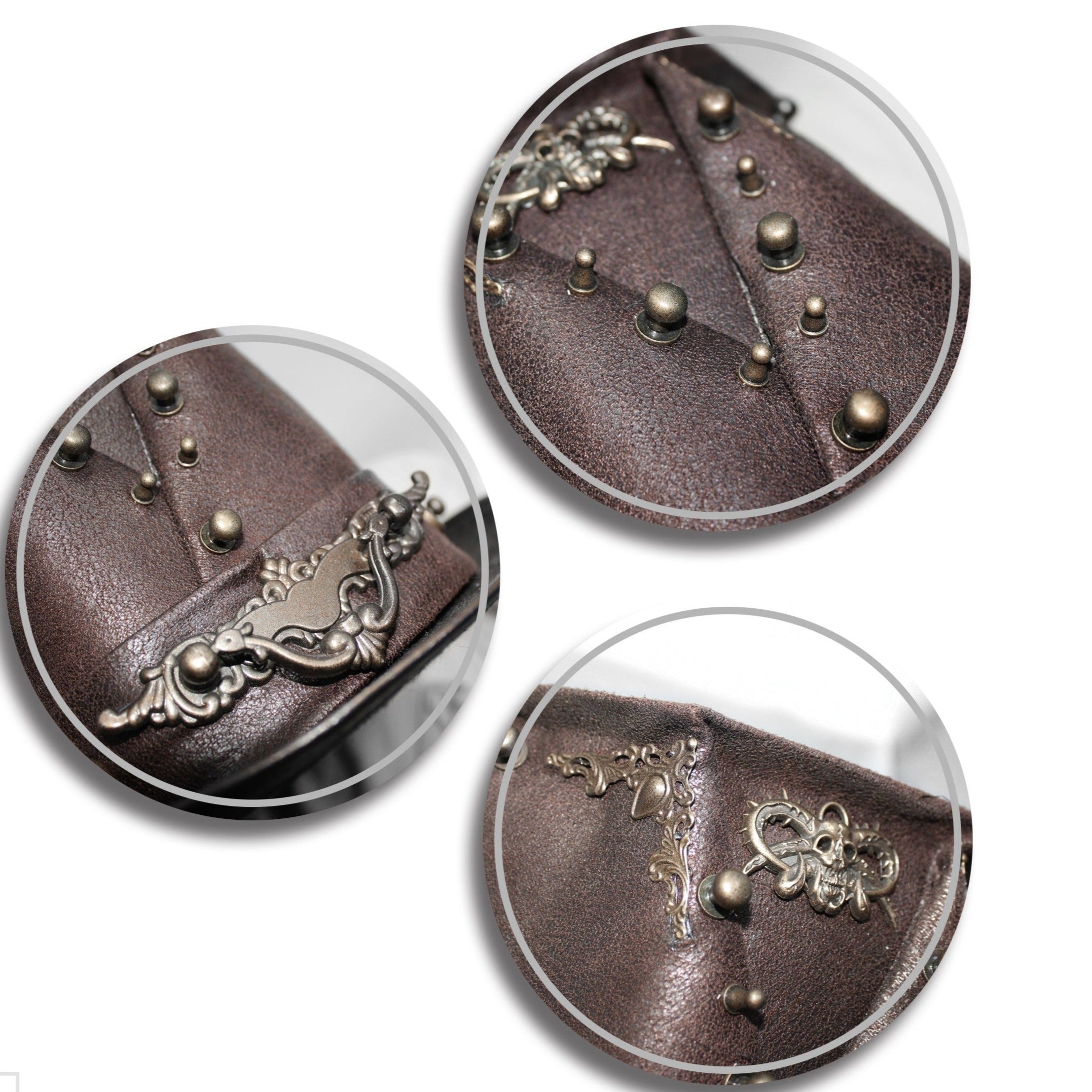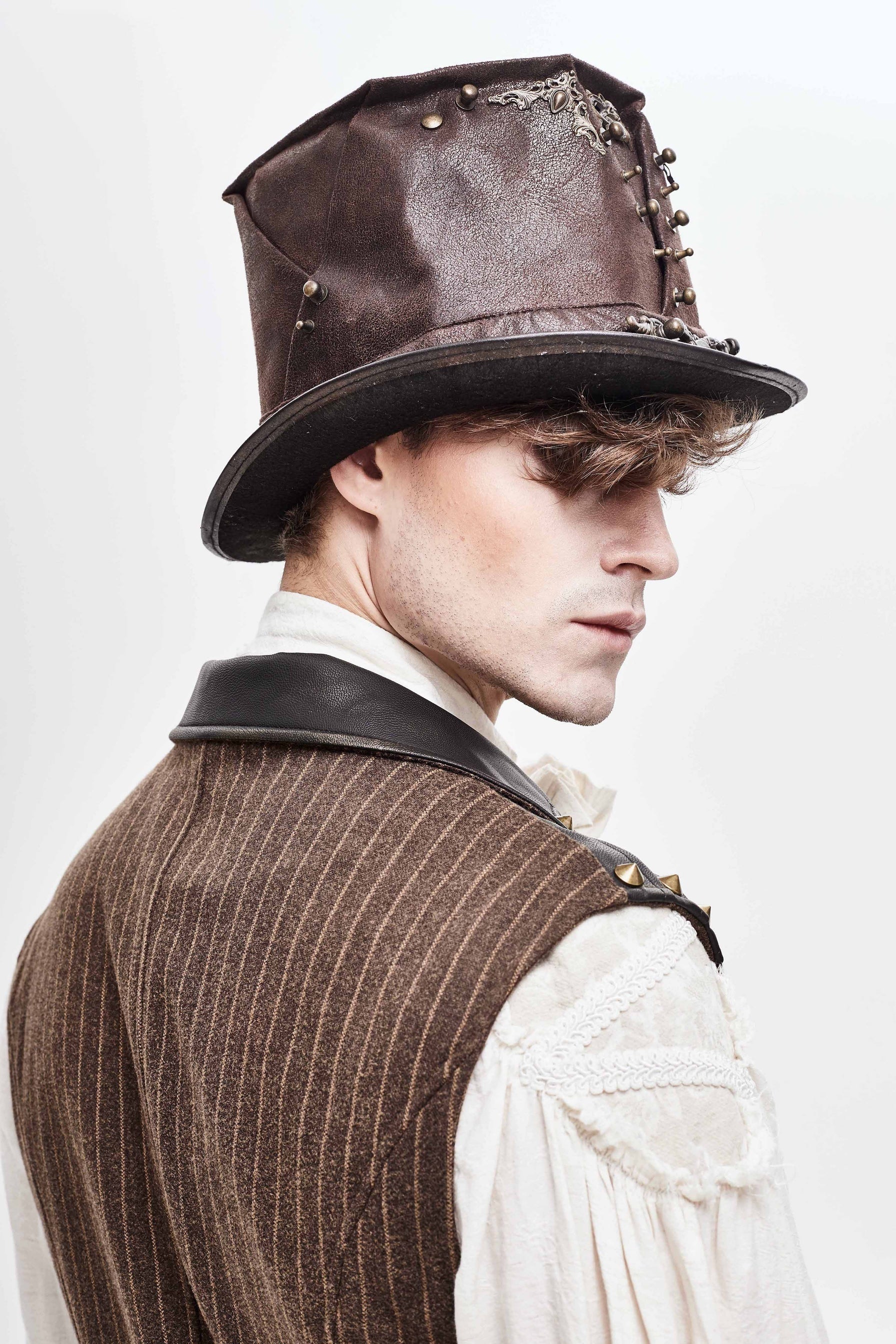 A perfectly worn brown hat with eccentric steampunk rivets and a skull and horns on the front plus a door-handle style center piece pendant.