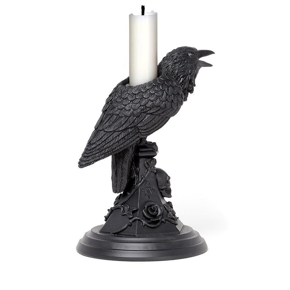A dark and dramatic candle stick incorporating a Raven, Rose and Skull to add a dramatic flourish to your dining table or altar.