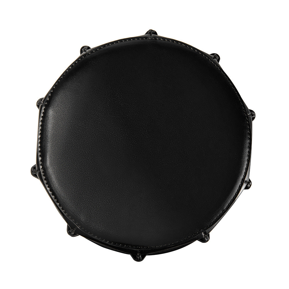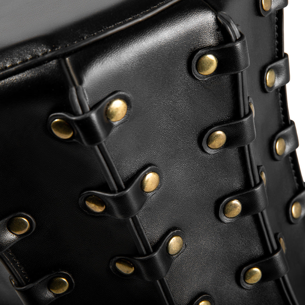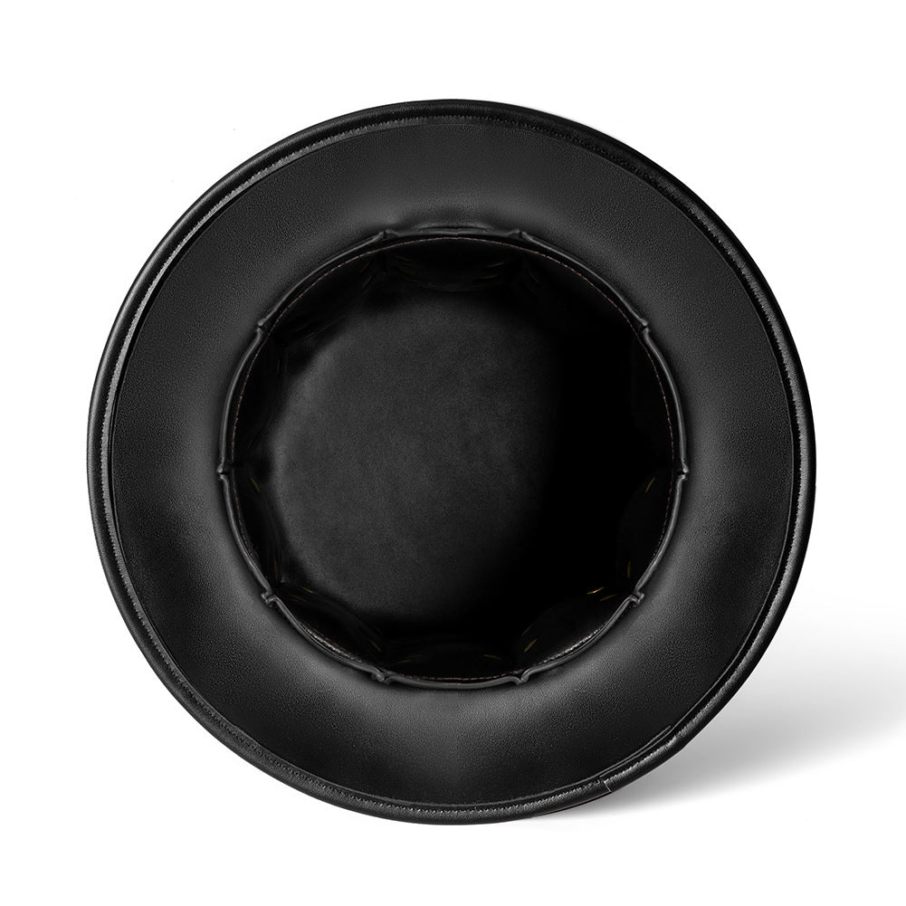A eccentric and dapper faux leather top hat with fantastic gold rivets and a wonky structure which delivers Alice In Wonderland Mad Hatter vibes..