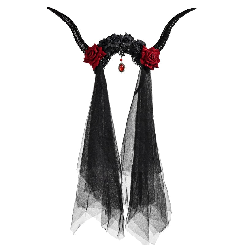 A gorgeous black sheer veil on a black and red rose-adorned and horned headband. A hanging gem (in Black or Red) falls from the crown to your forehead.