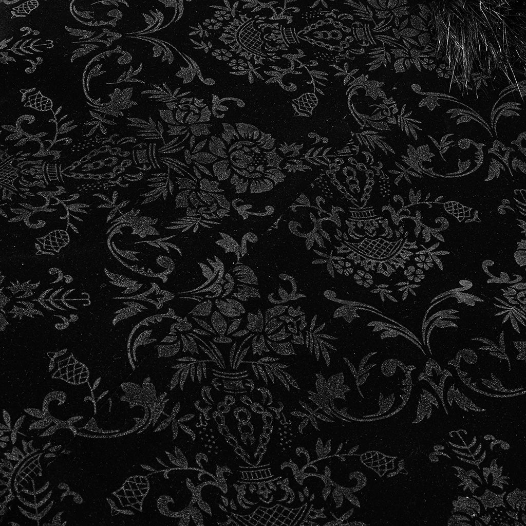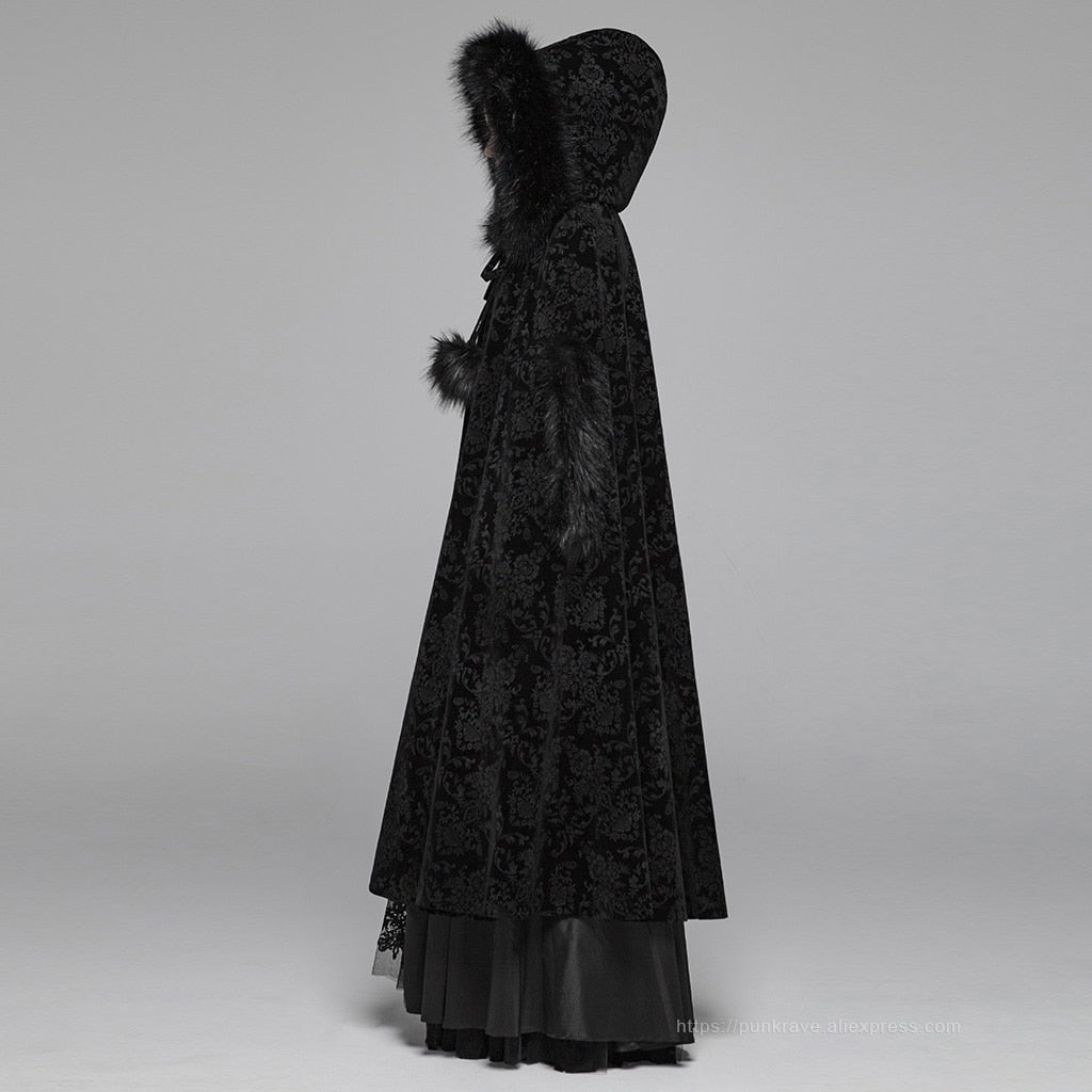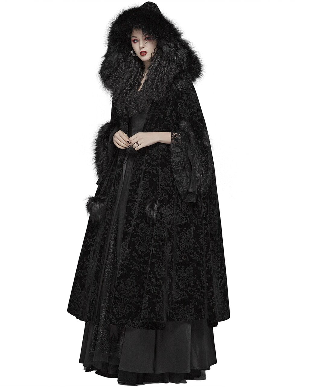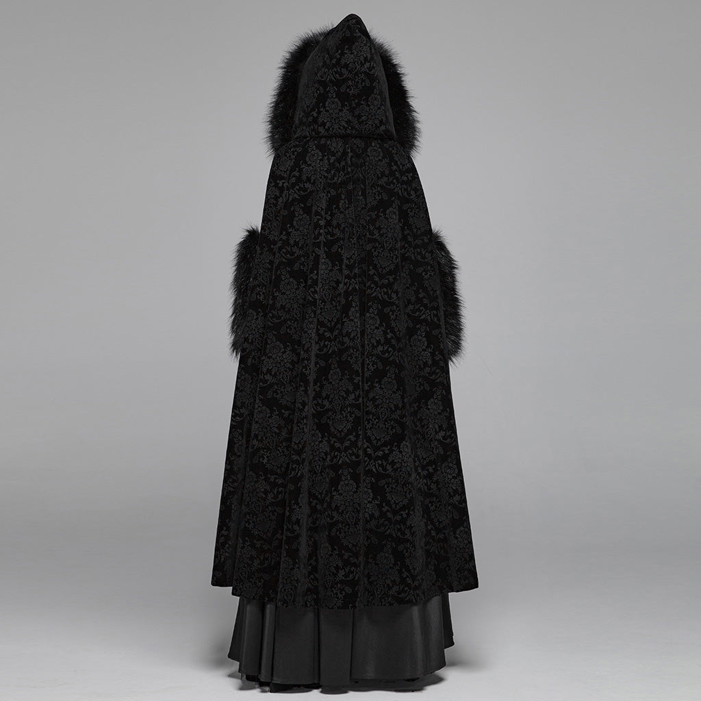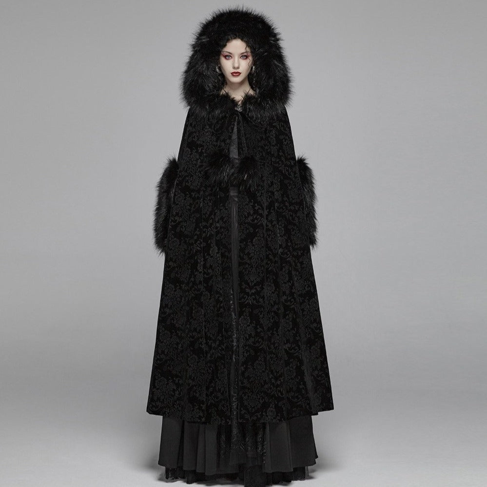 A long, ornately damask-patterned velveteen cloak with an oversized hood and faux fur trims, embodying gorgeous gothic glamour.