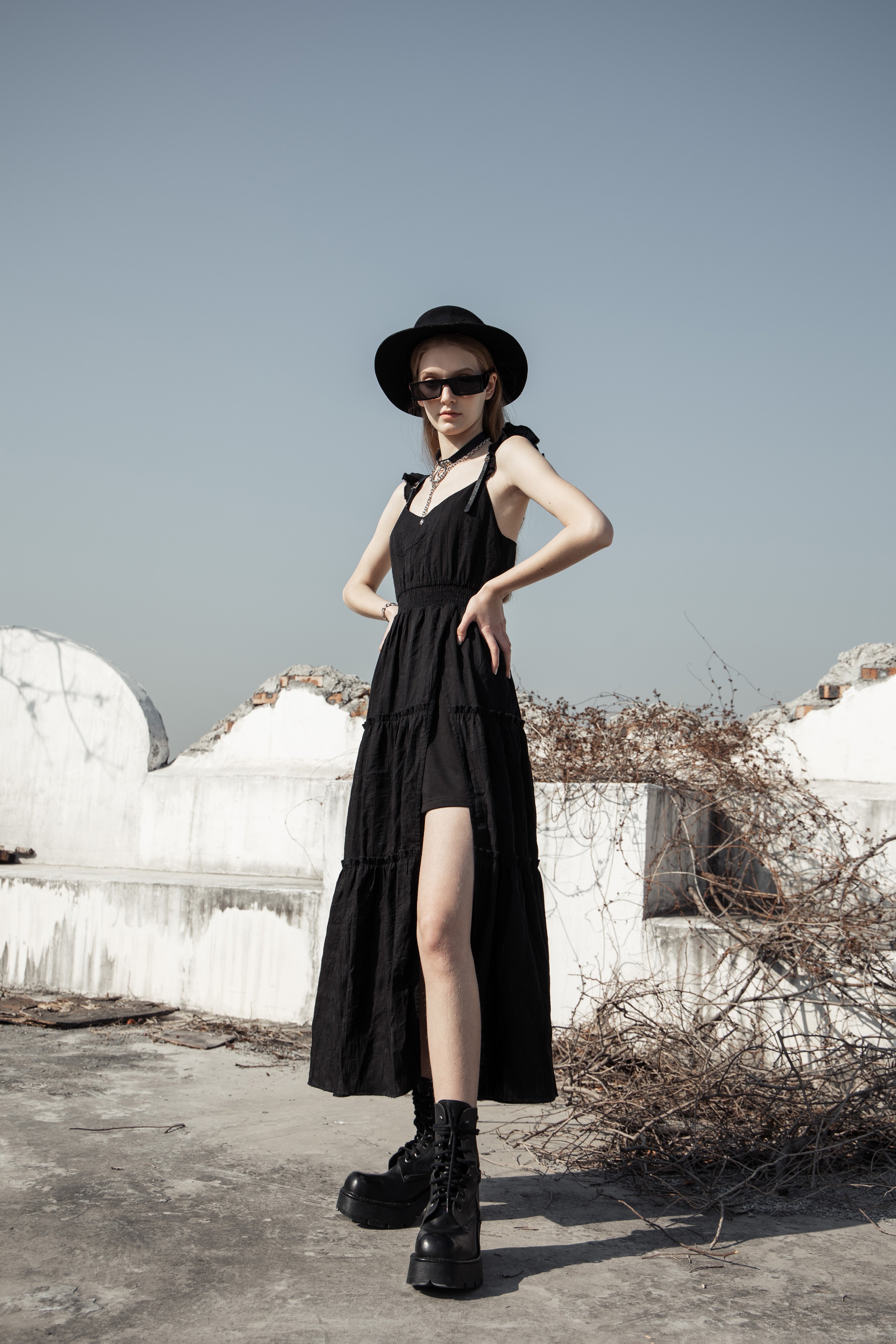 This dress provides southern gothic aesthetic vibes, and it's subtle witchy design details include a centre eye pendant and faux-leather buckled shoulder straps.