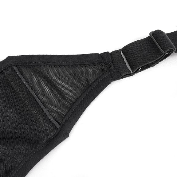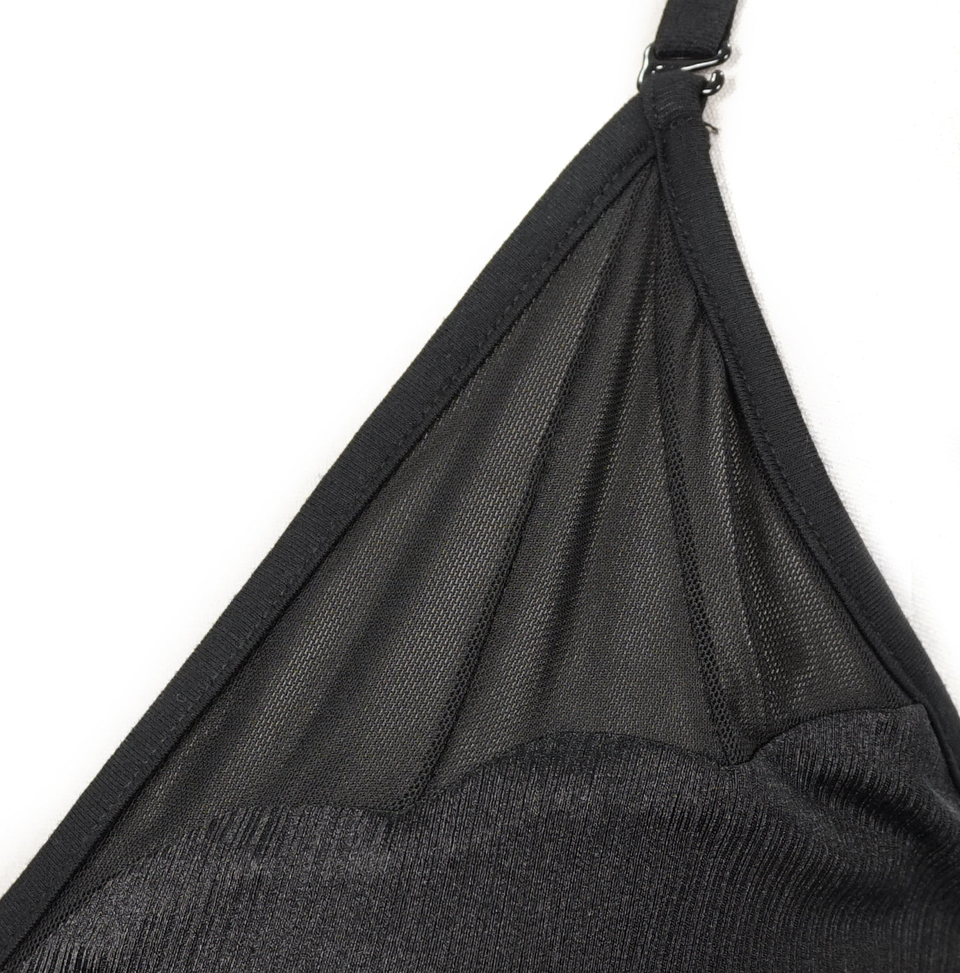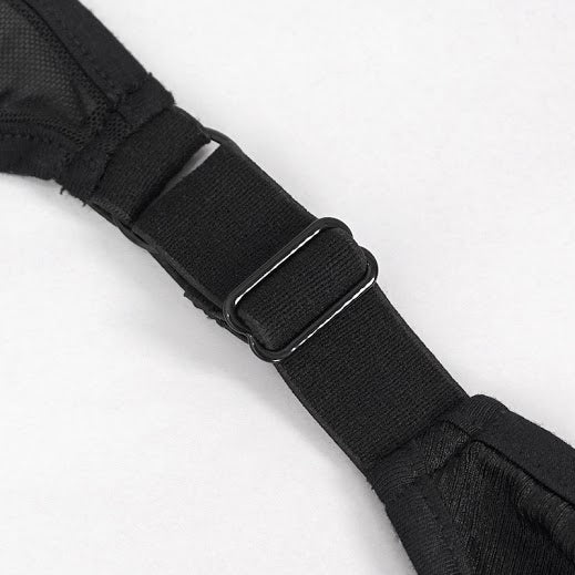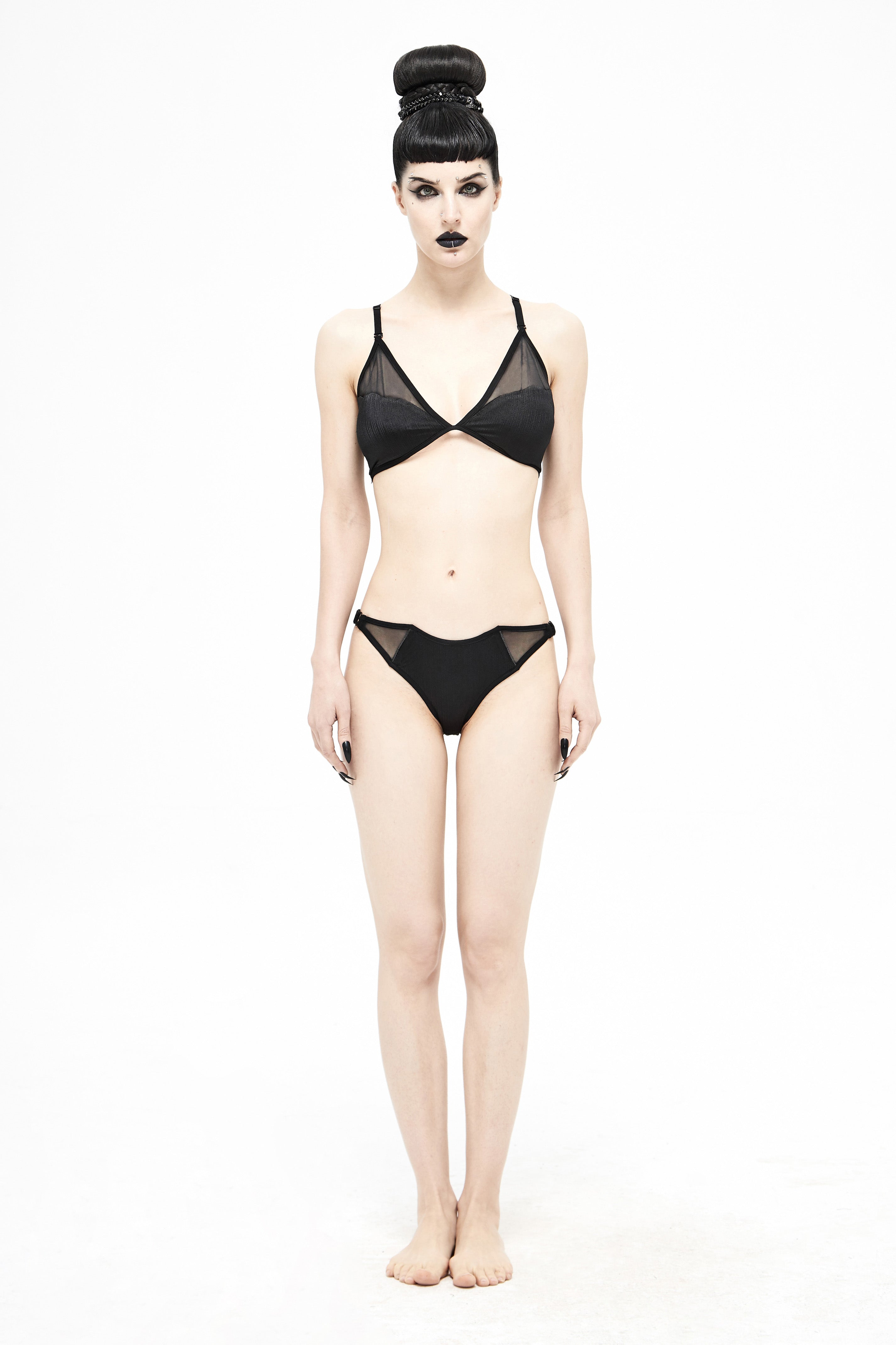 Sheer black panelling on the top provides a sexy, flattering style and a criss-cross laced back panel add to the goth vibes. The bikini bottom silhouette dips in the center, in an unbelievable batwing shape.