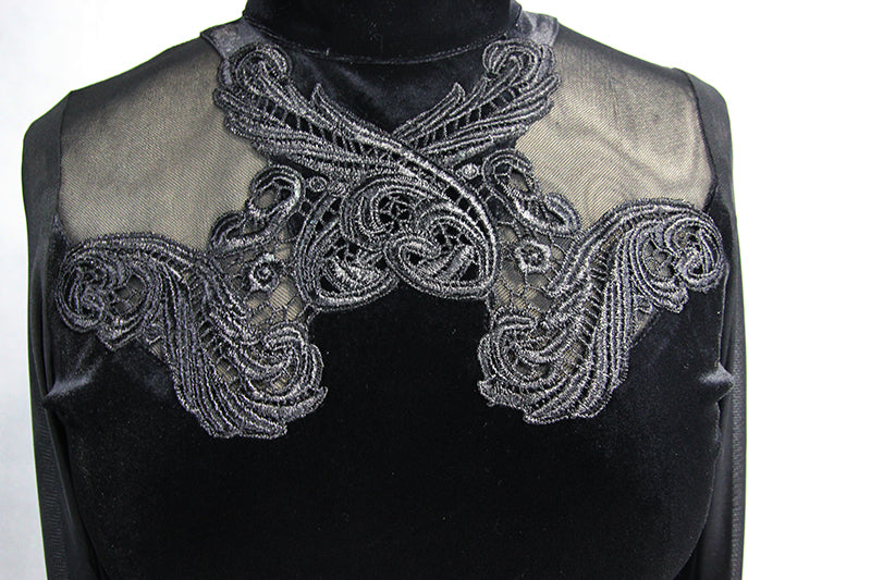 An ornate Gothic chest and neck design piece with matching hip design forms a Cross shape of coverage in the center of this dress, while sheer sides reveal just enough skin to tantalize..