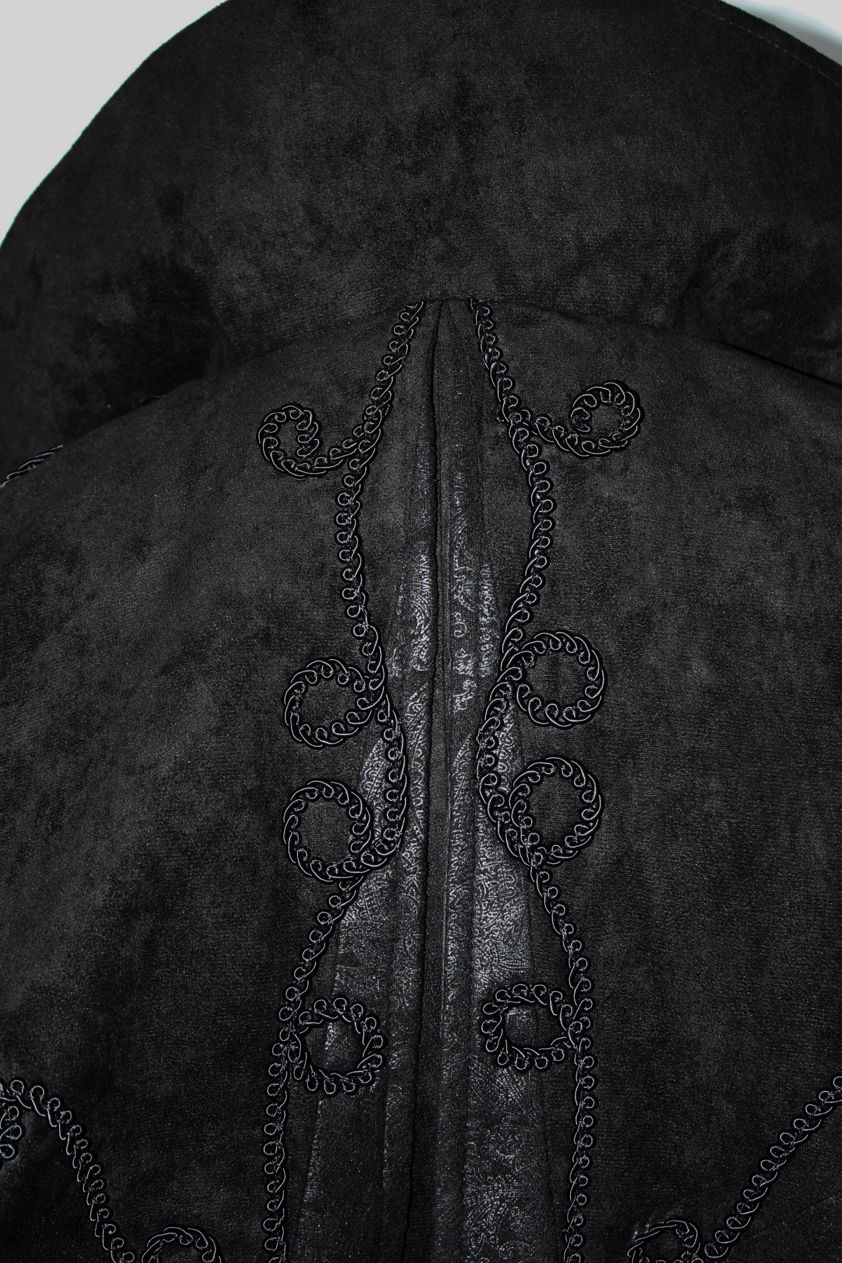 A subtle dark tapestry patterned fabric is embellished with ornate buttons and unique design details on the cuffs, collar and pockets.