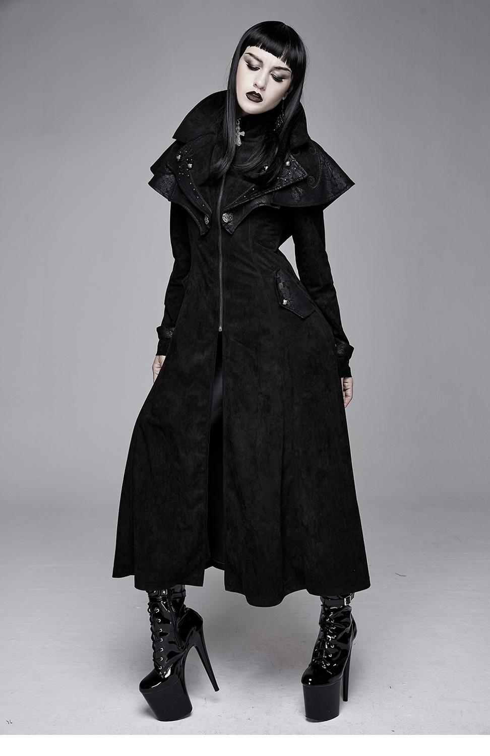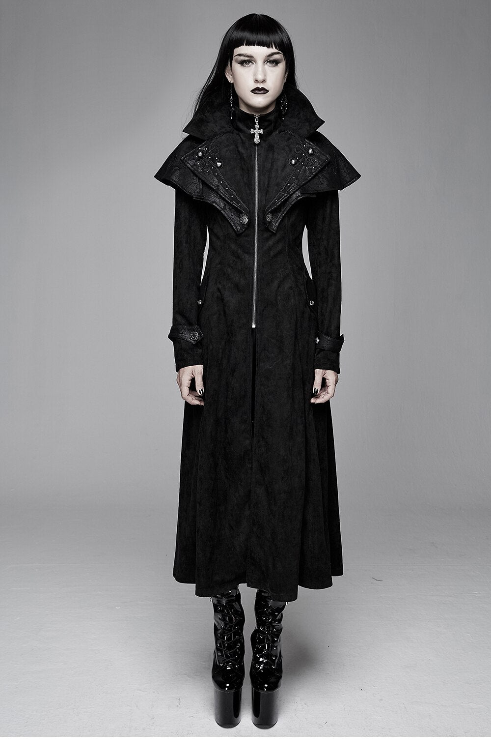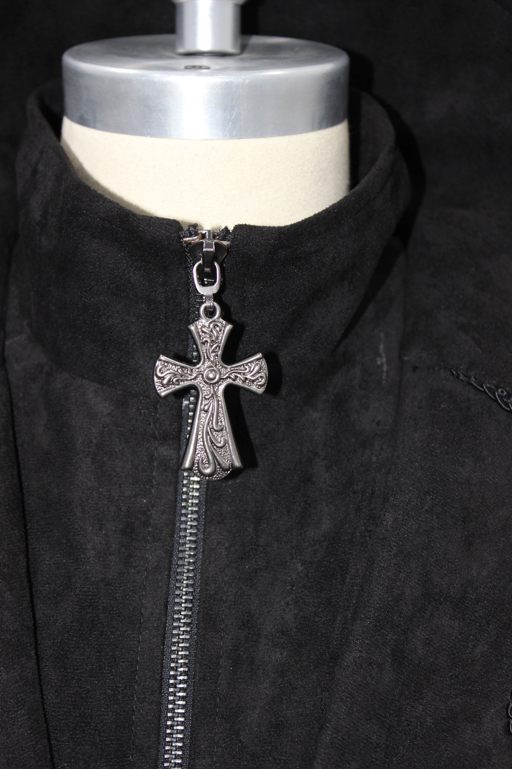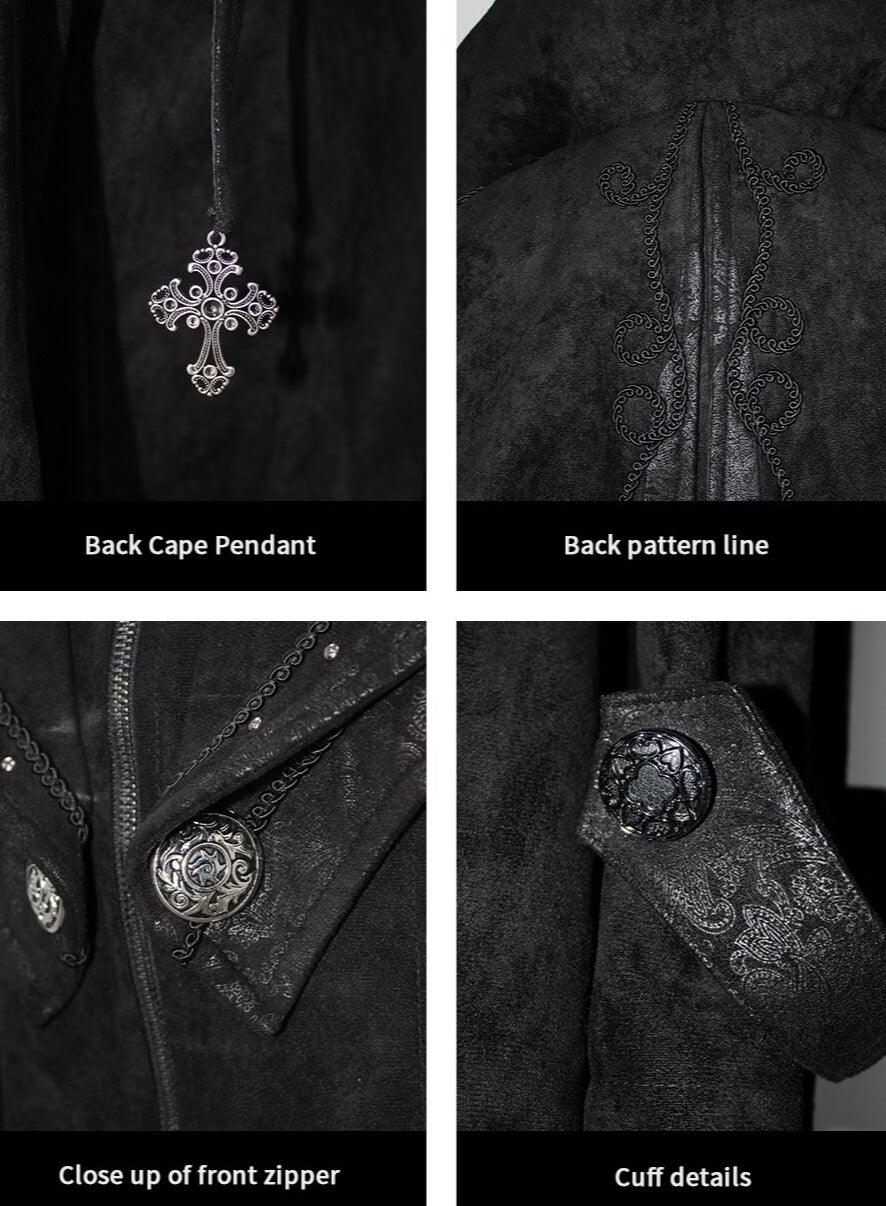 We love the statement crucifix zipper front, high stand-up collar and amazing capelet pieces at the back, also attached to cross pendants.