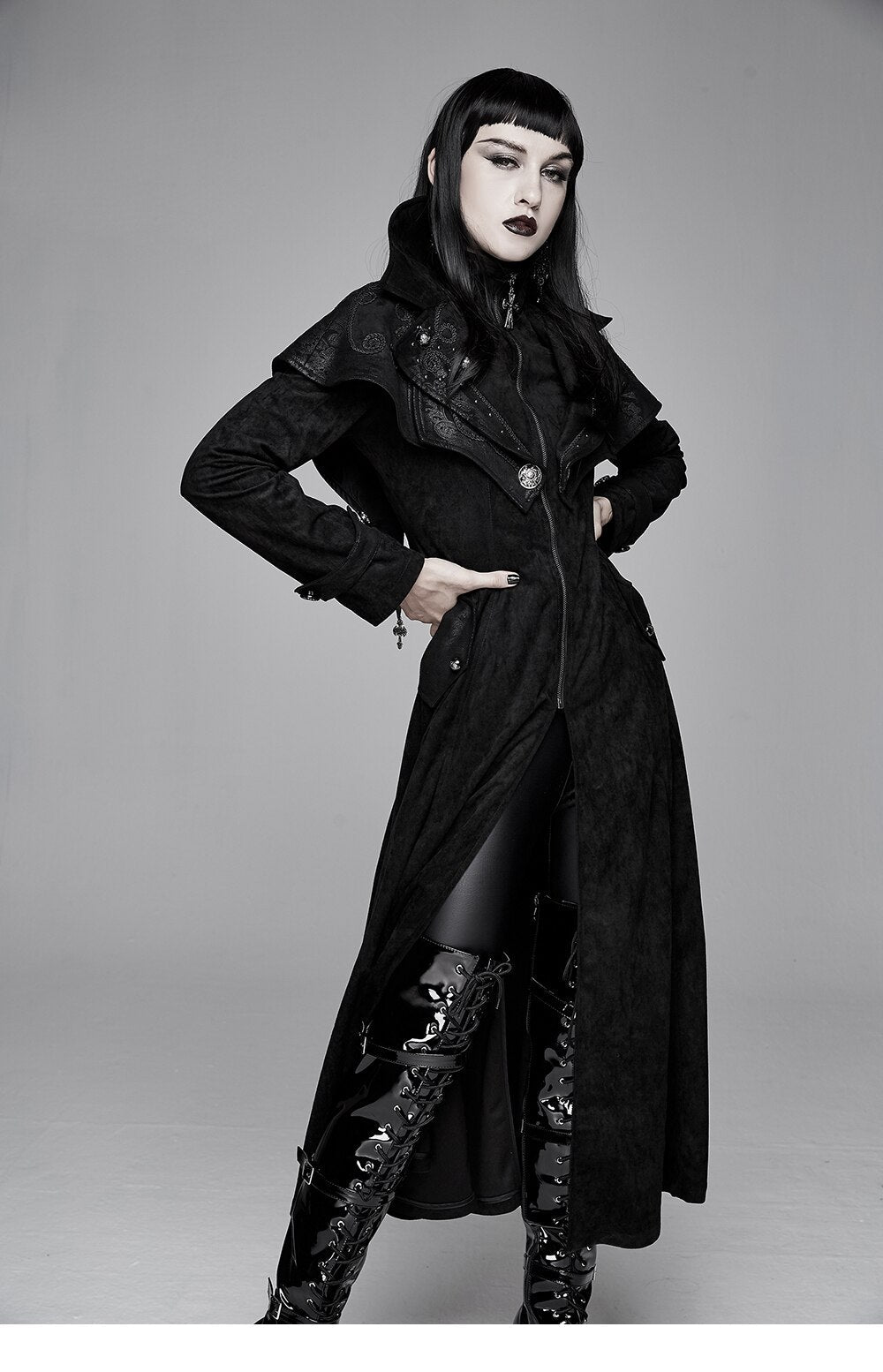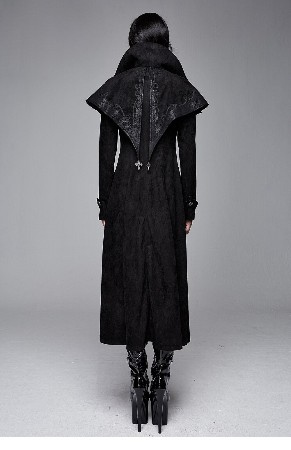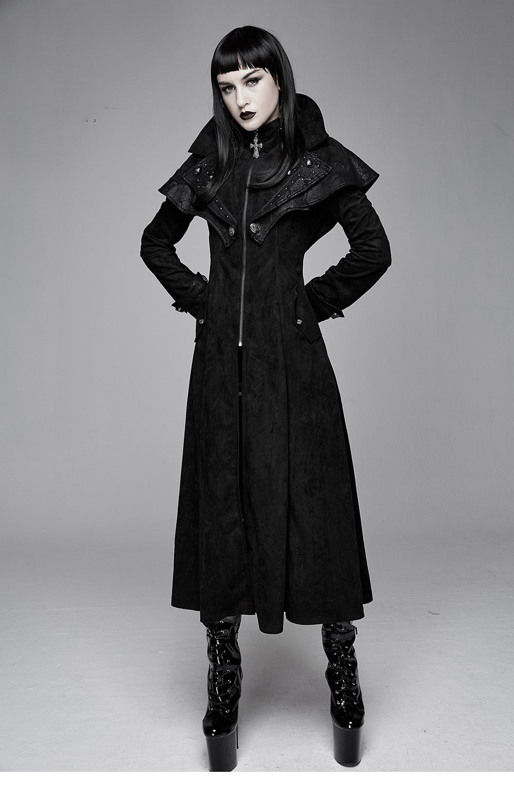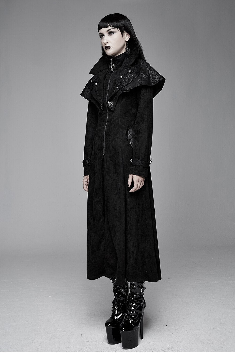 We love the statement crucifix zipper front, high stand-up collar and amazing capelet pieces at the back, also attached to cross pendants.