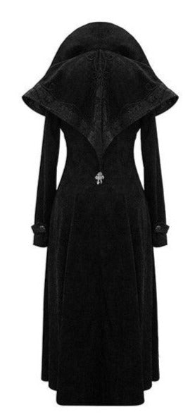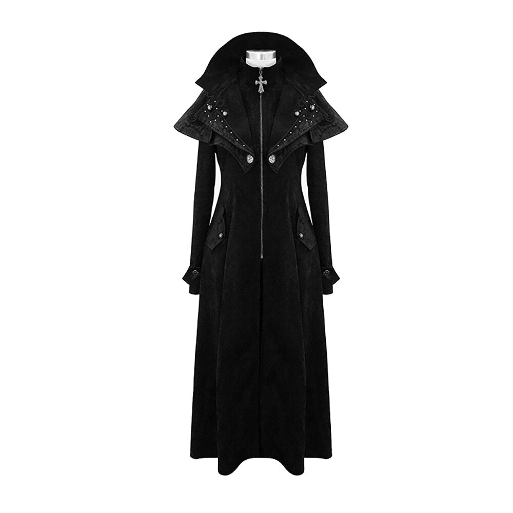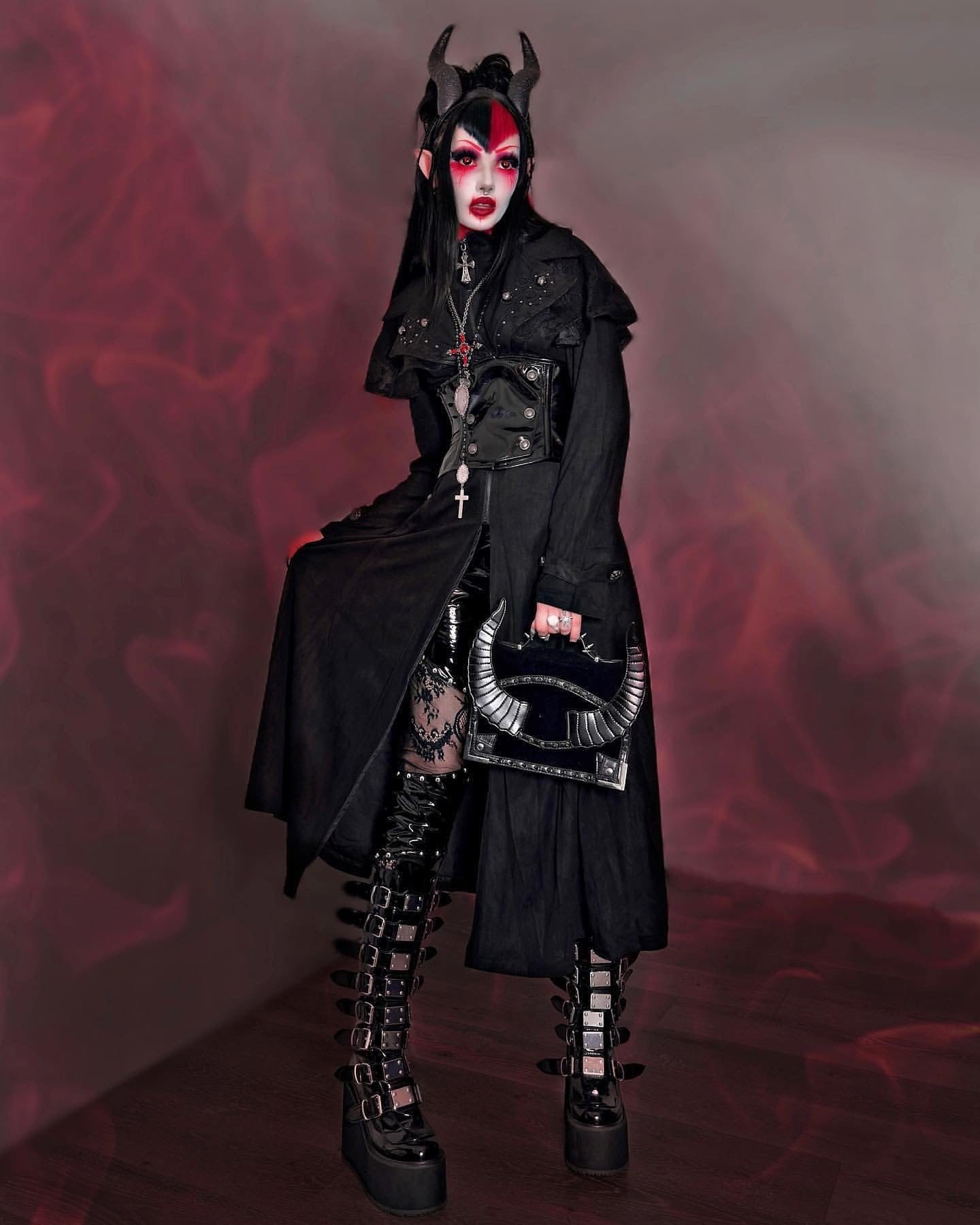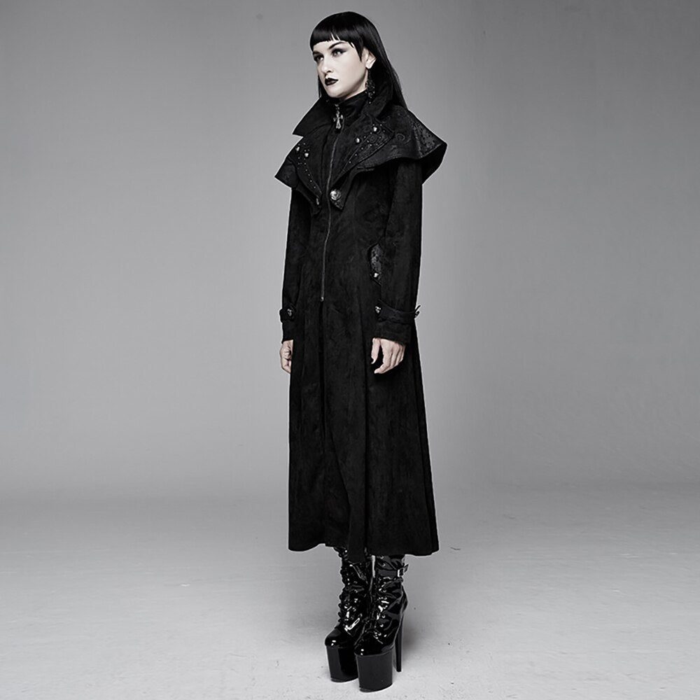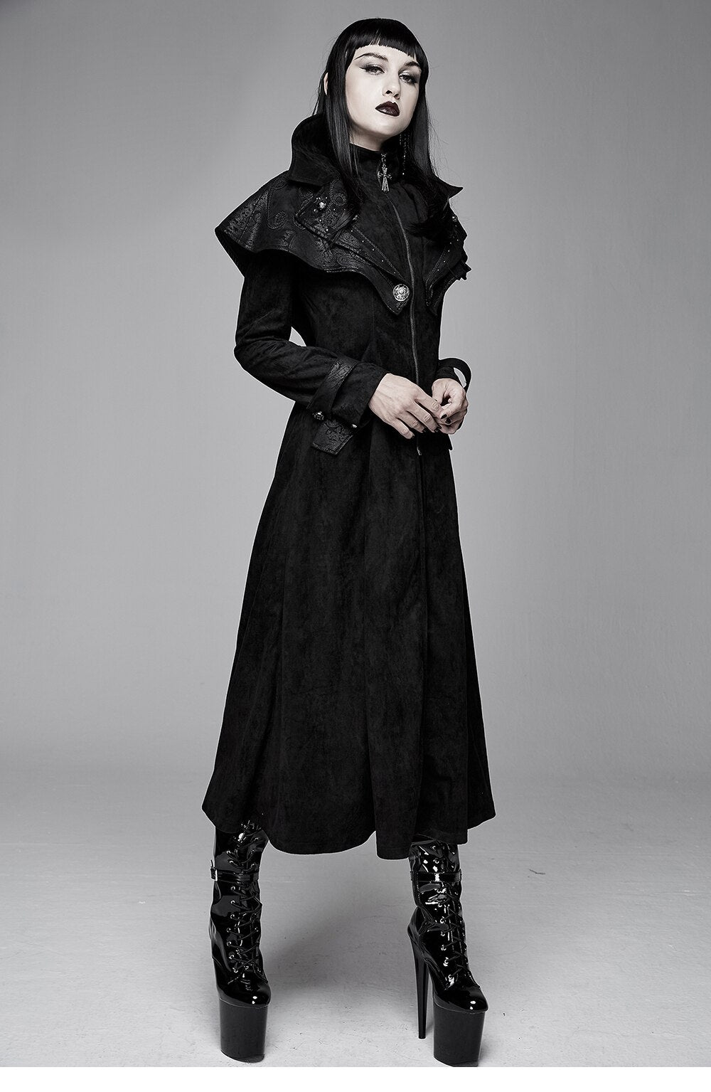 We love the statement crucifix zipper front, high stand-up collar and amazing capelet pieces at the back, also attached to cross pendants.