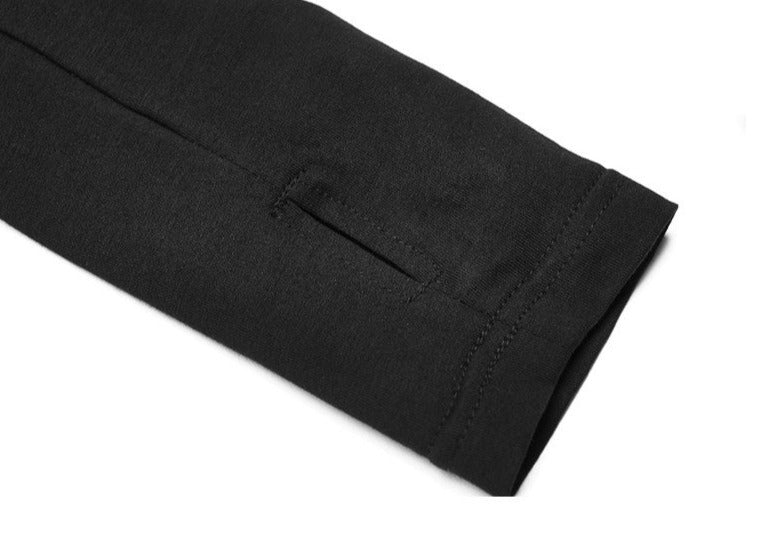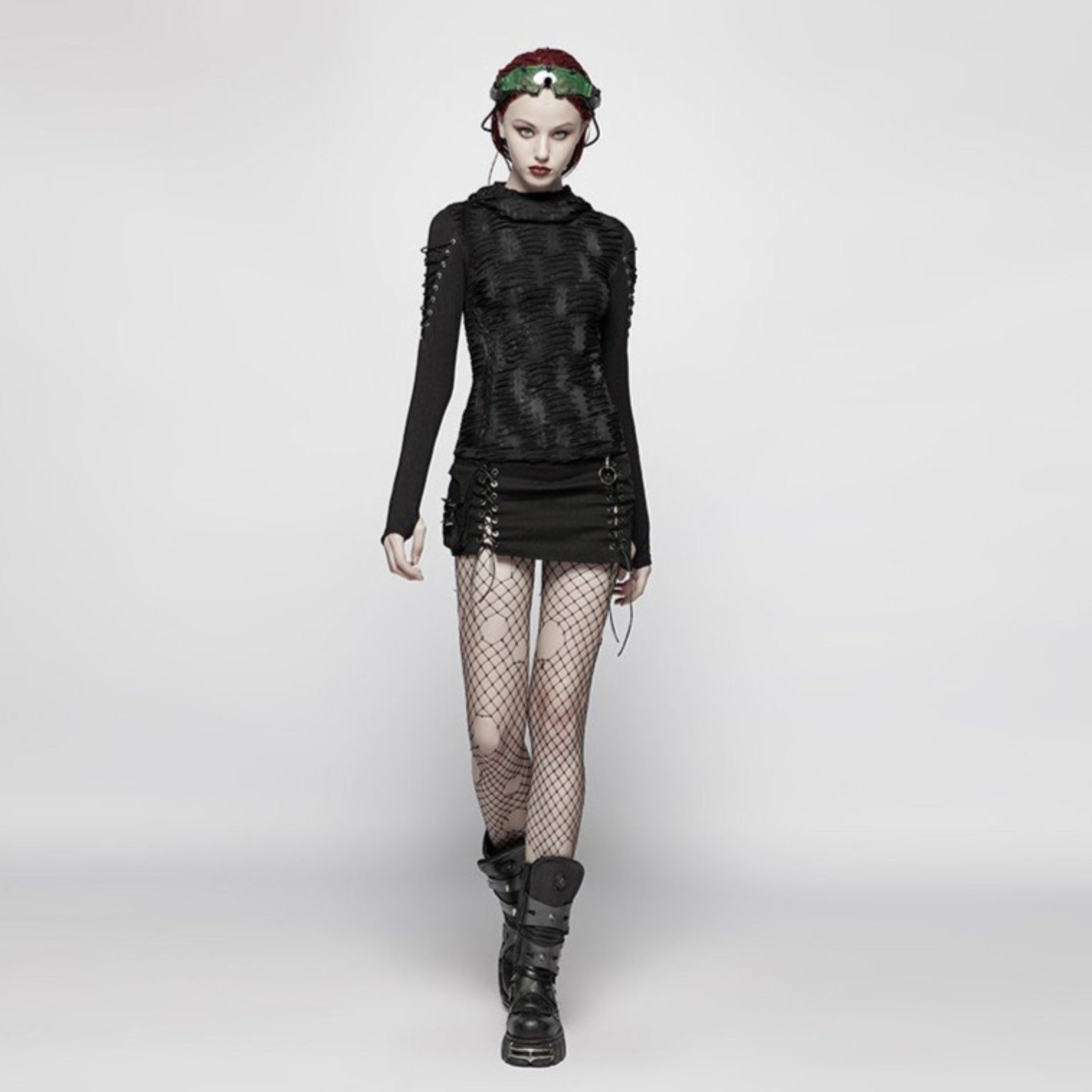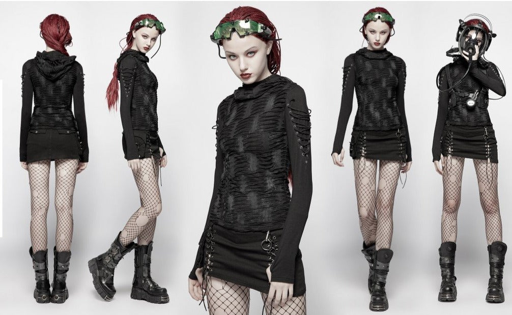 A superbly textured long sleeved top with a large hood, front cowl neck and draped sleeves with thumb loops. Faux distressed marks give grimy steampunk vibes!