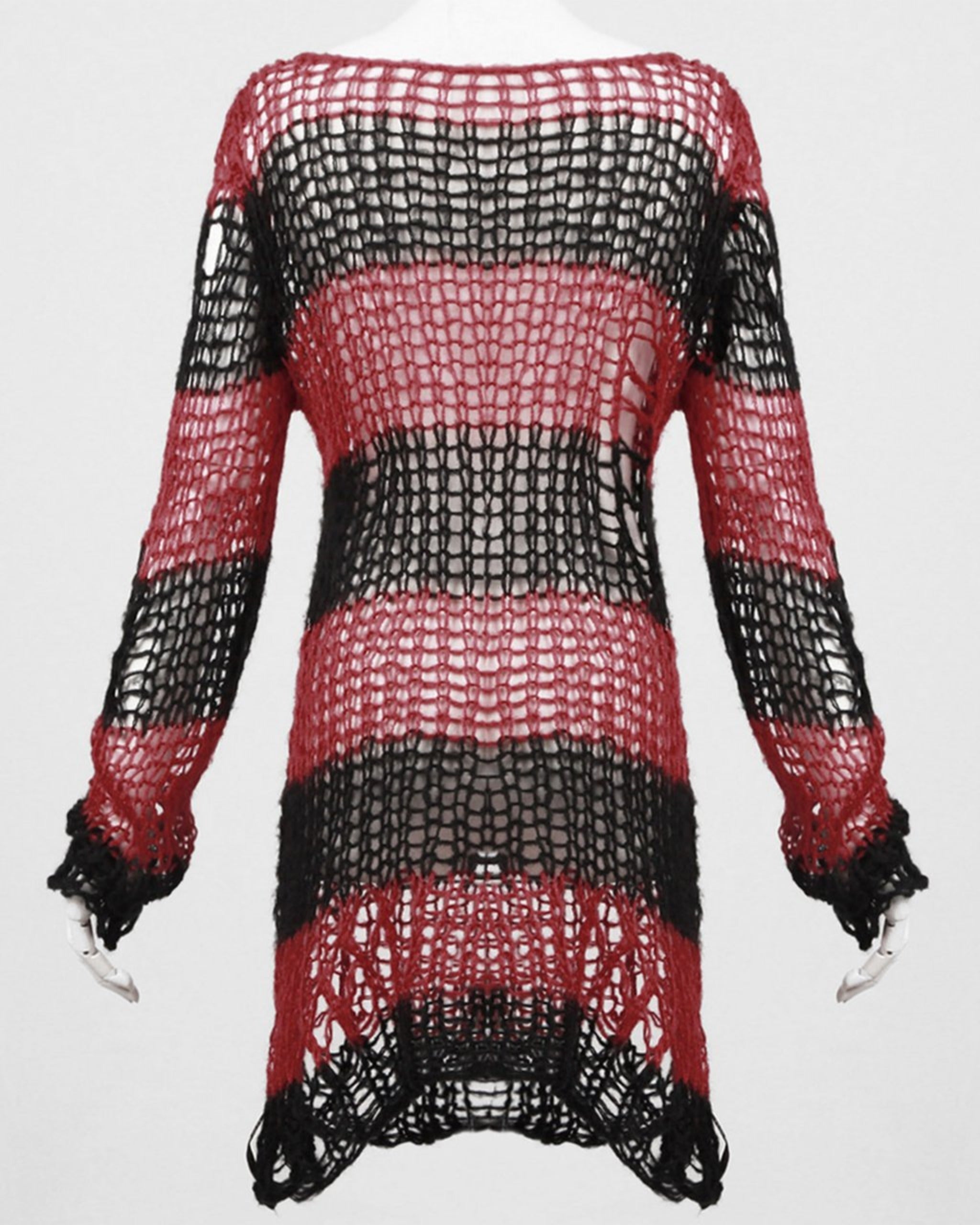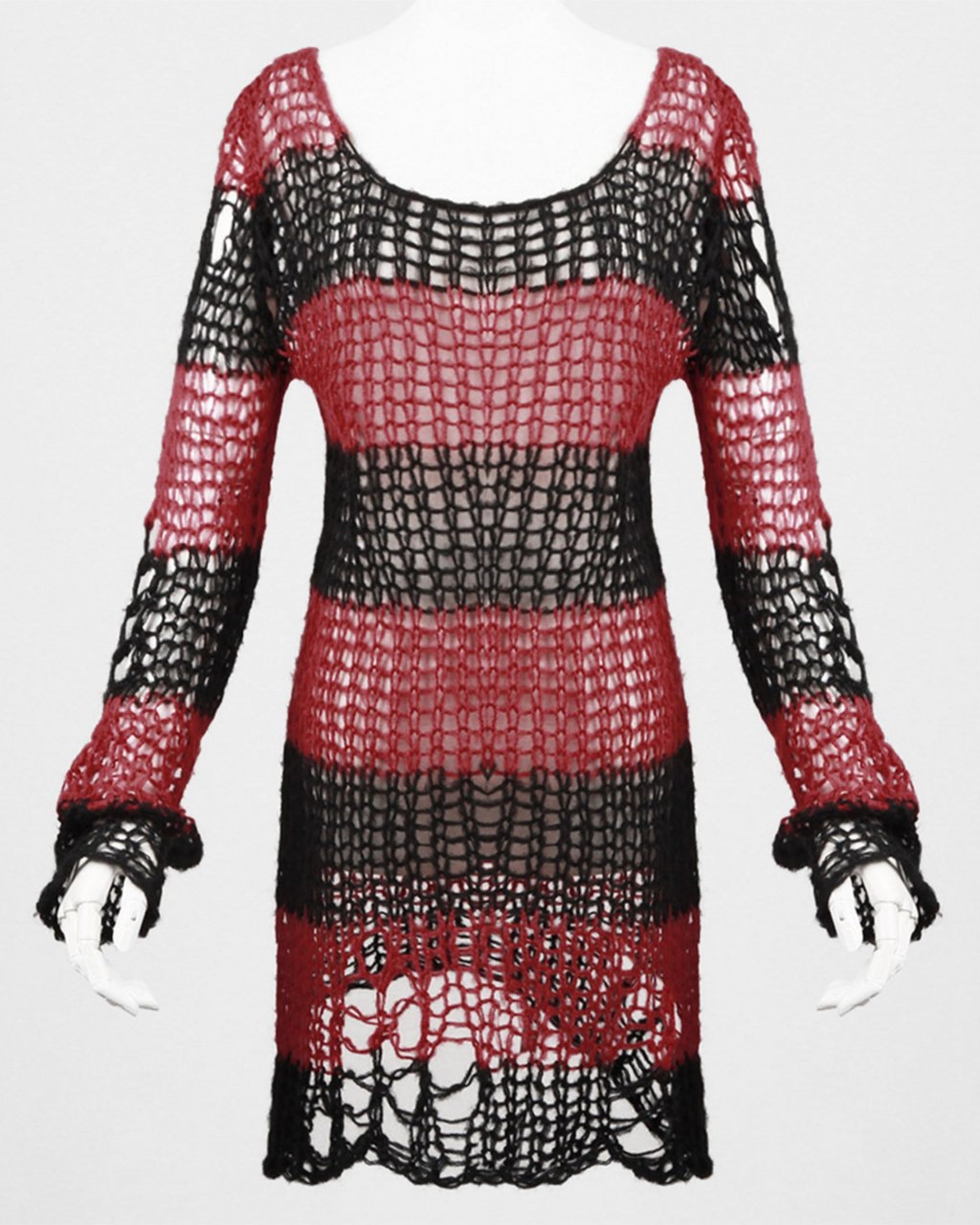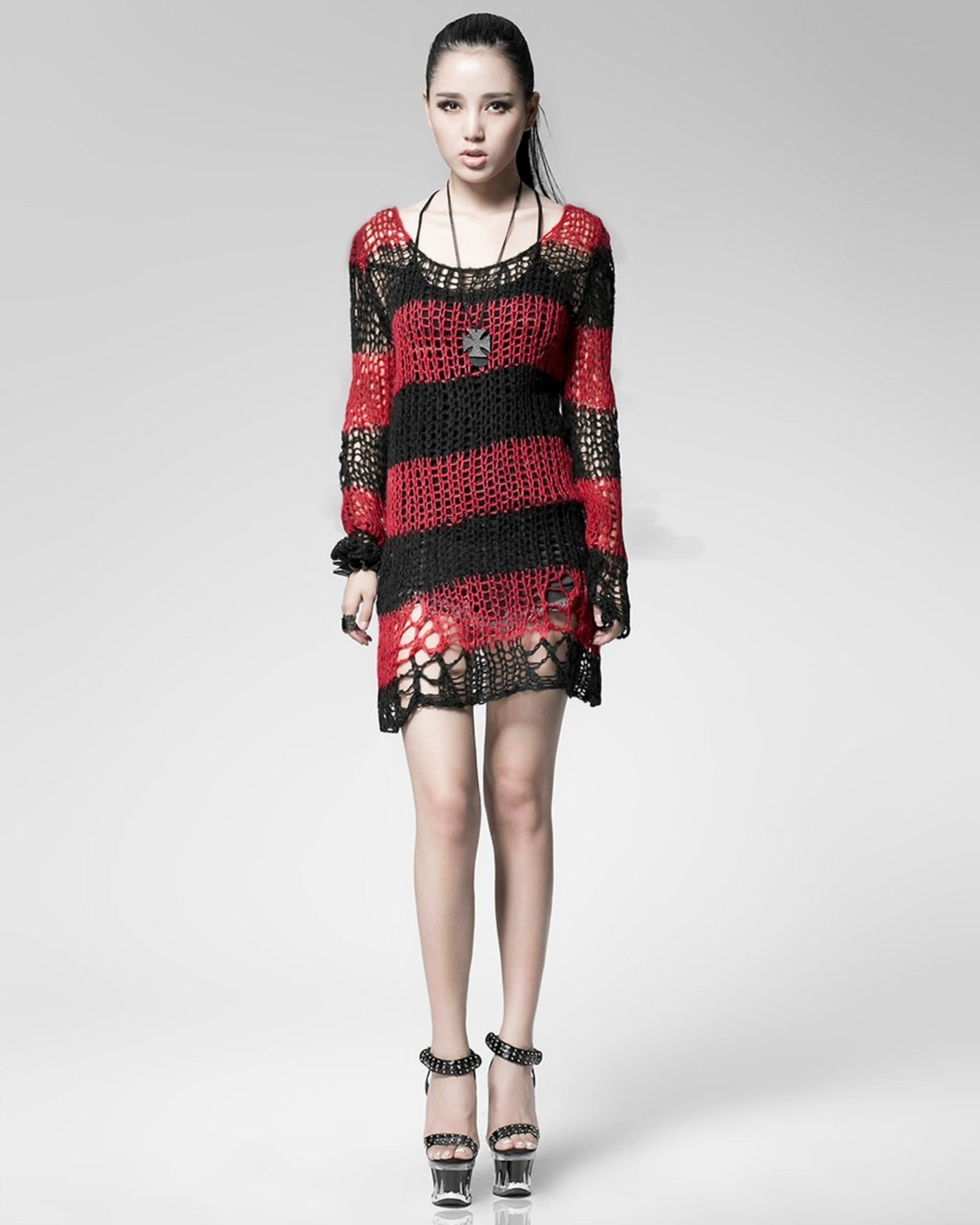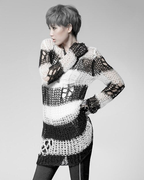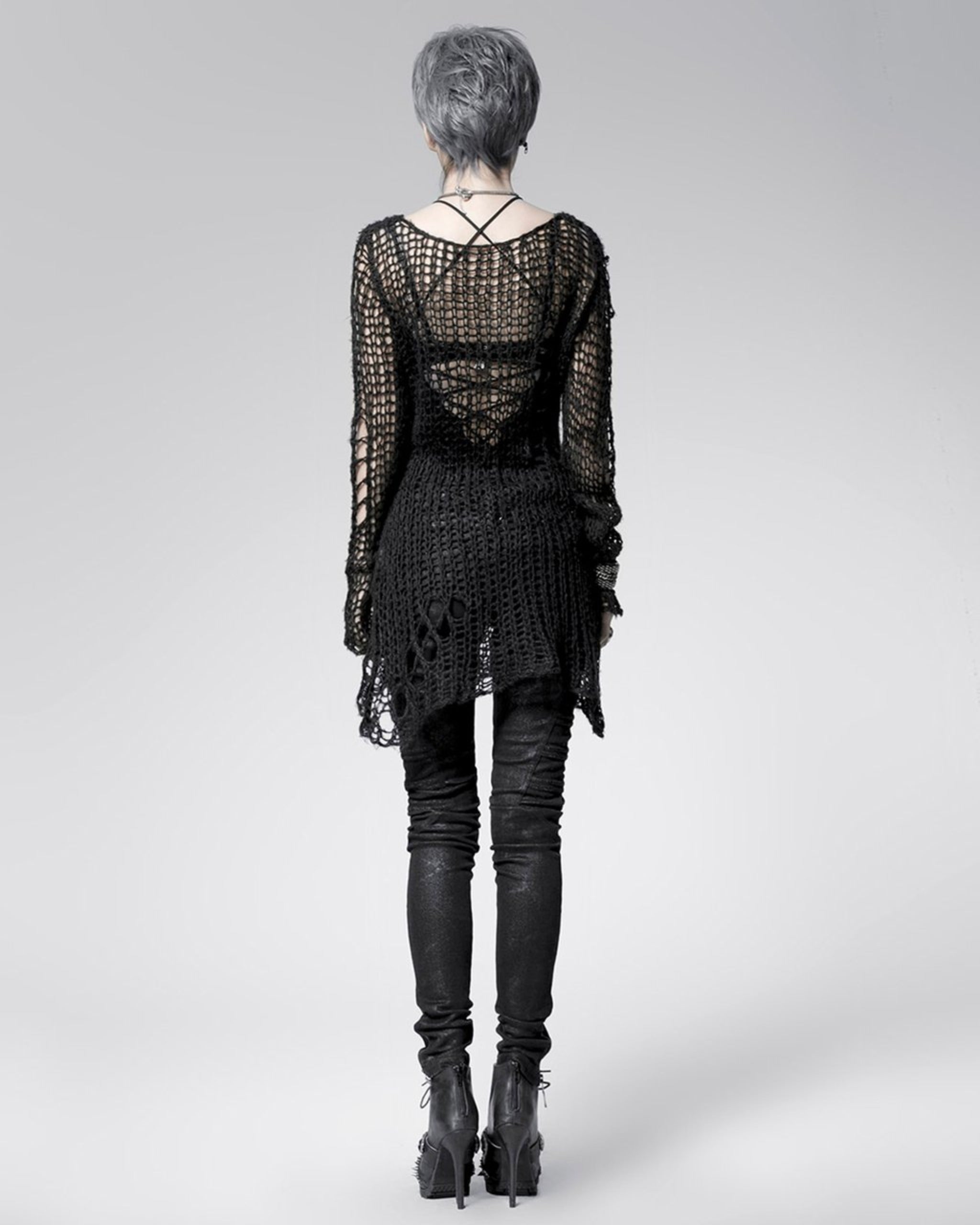 A super punk rock, strategically ripped and torn loose knit woolly jumper with oversized long baggy sleeves and a slouchy stretched-out length.