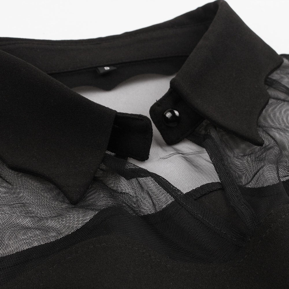 This gorgeous, feminine dress features a bat-wing style turn-down buttoned collar and delicate sheer bell sleeves.