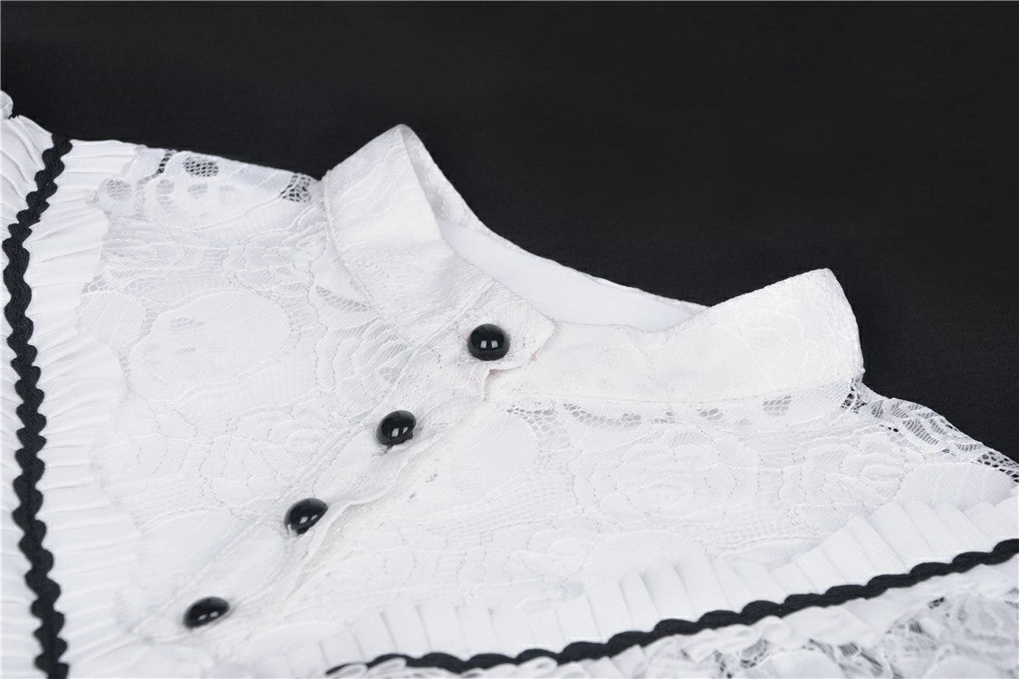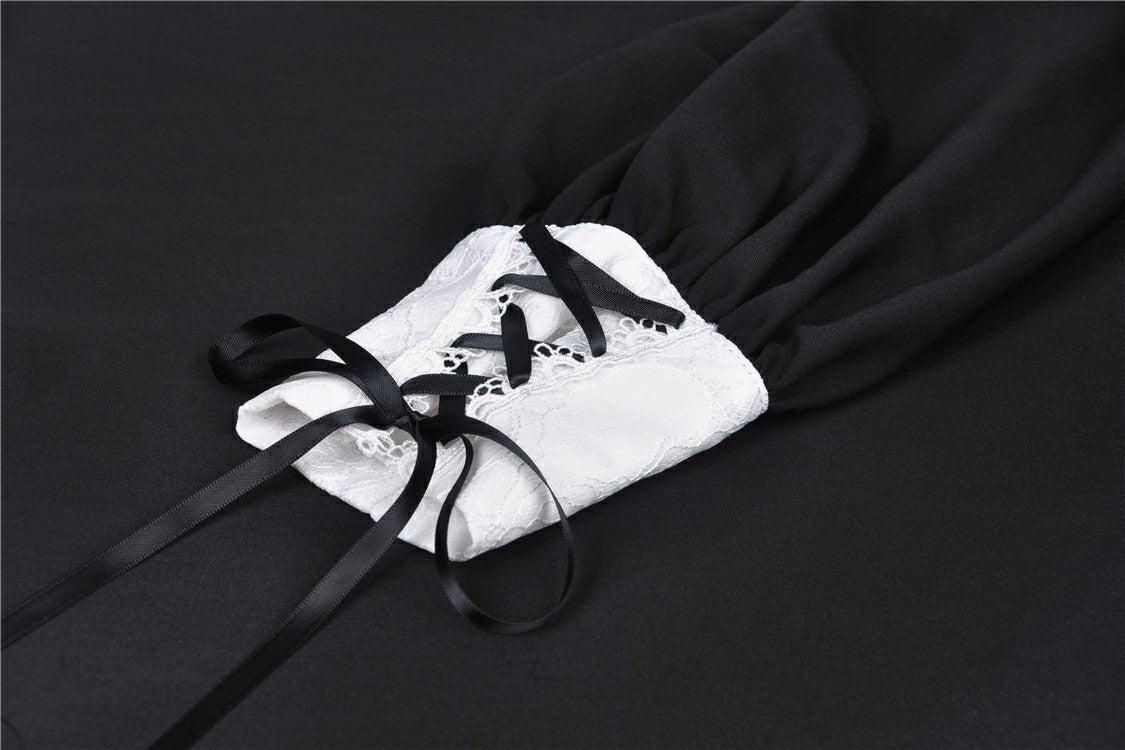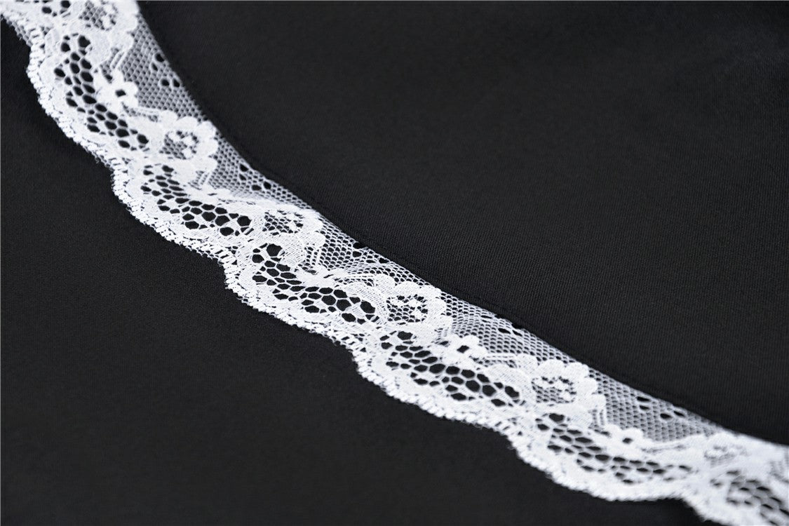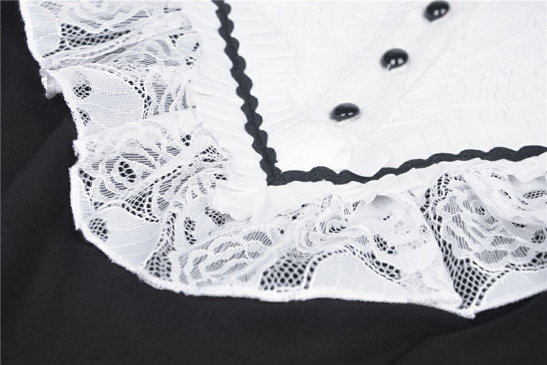 A beautifully cut gothic mini dress with a lace frilled chest panel and high buttoned collar.