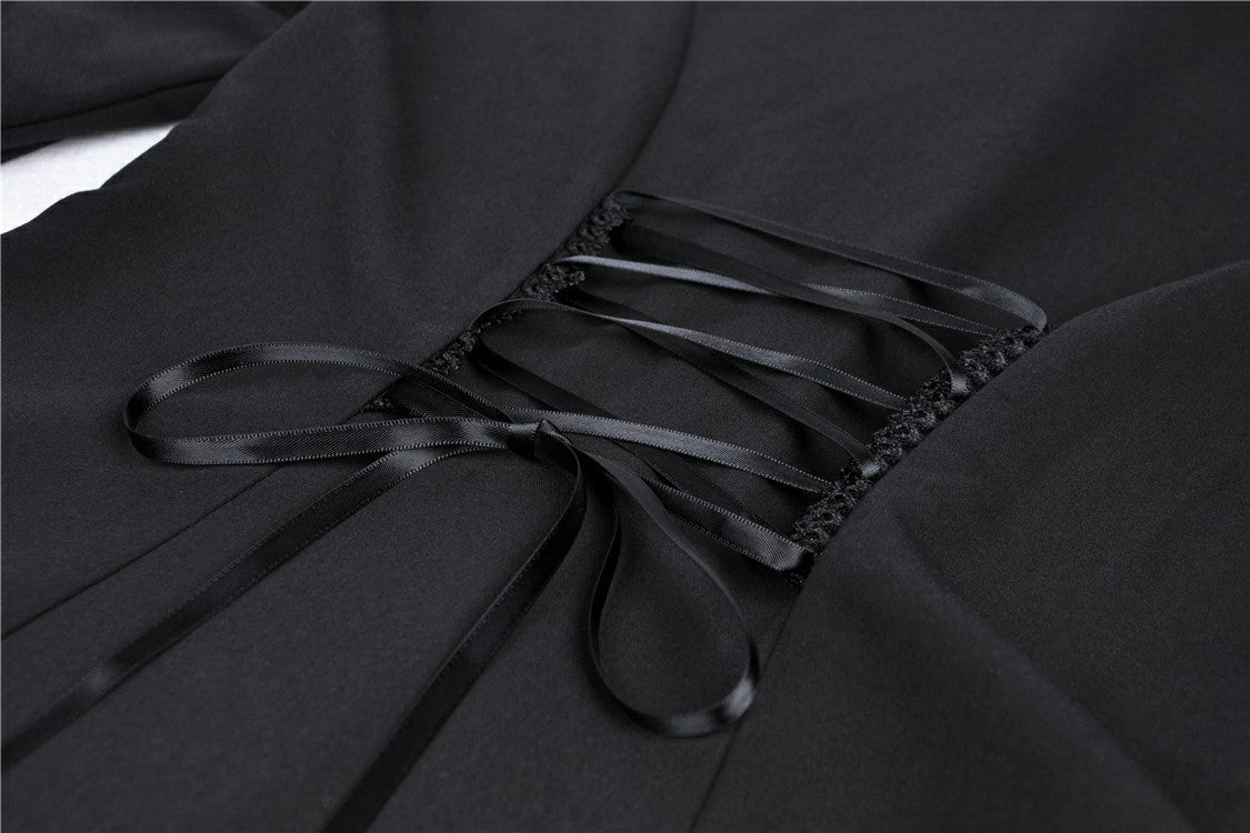 The arms have a stunning bell-sleeve drape, and the gorgeous laced-up cuffs add another unique design detail. The back panel is corseted with black ribbon.