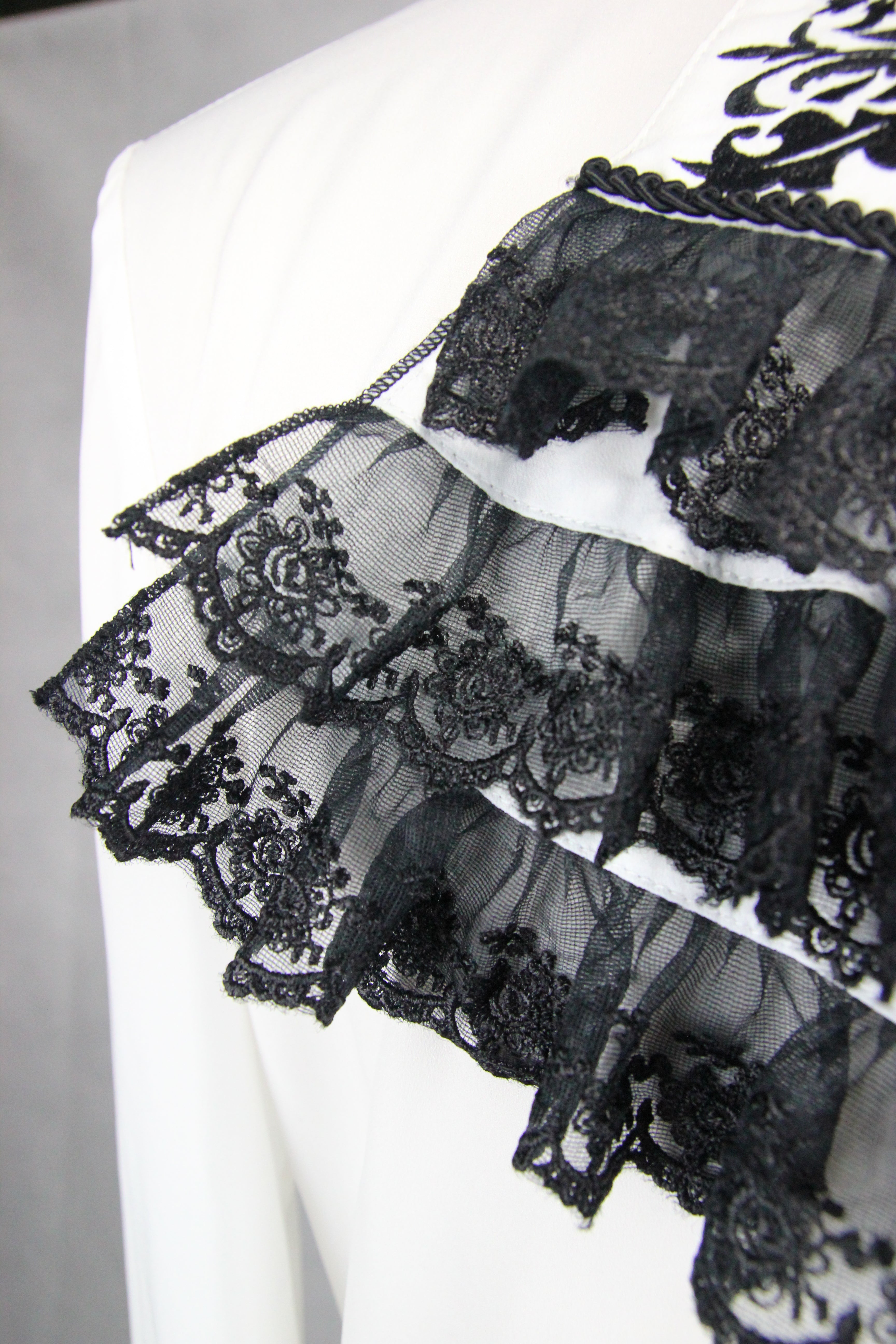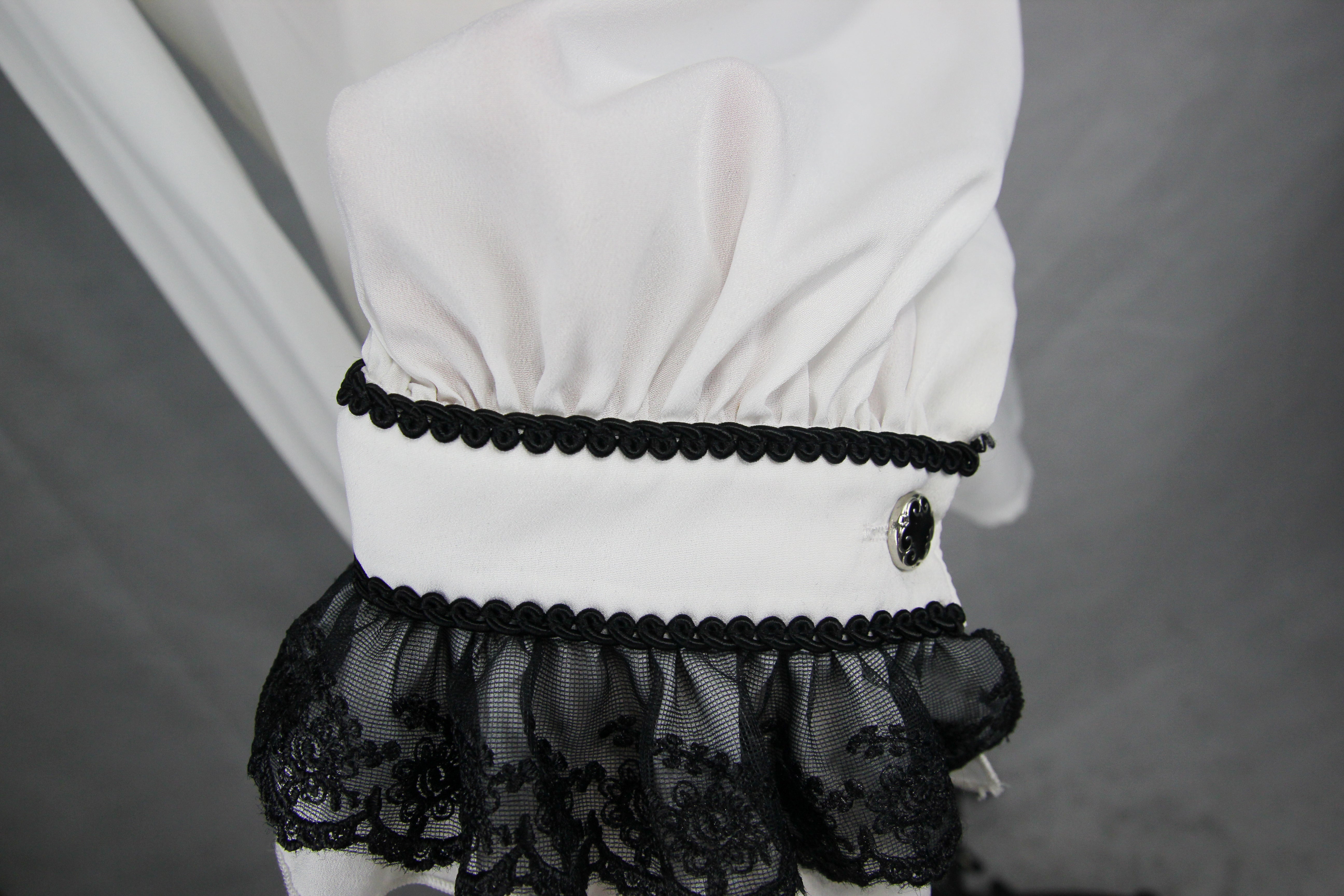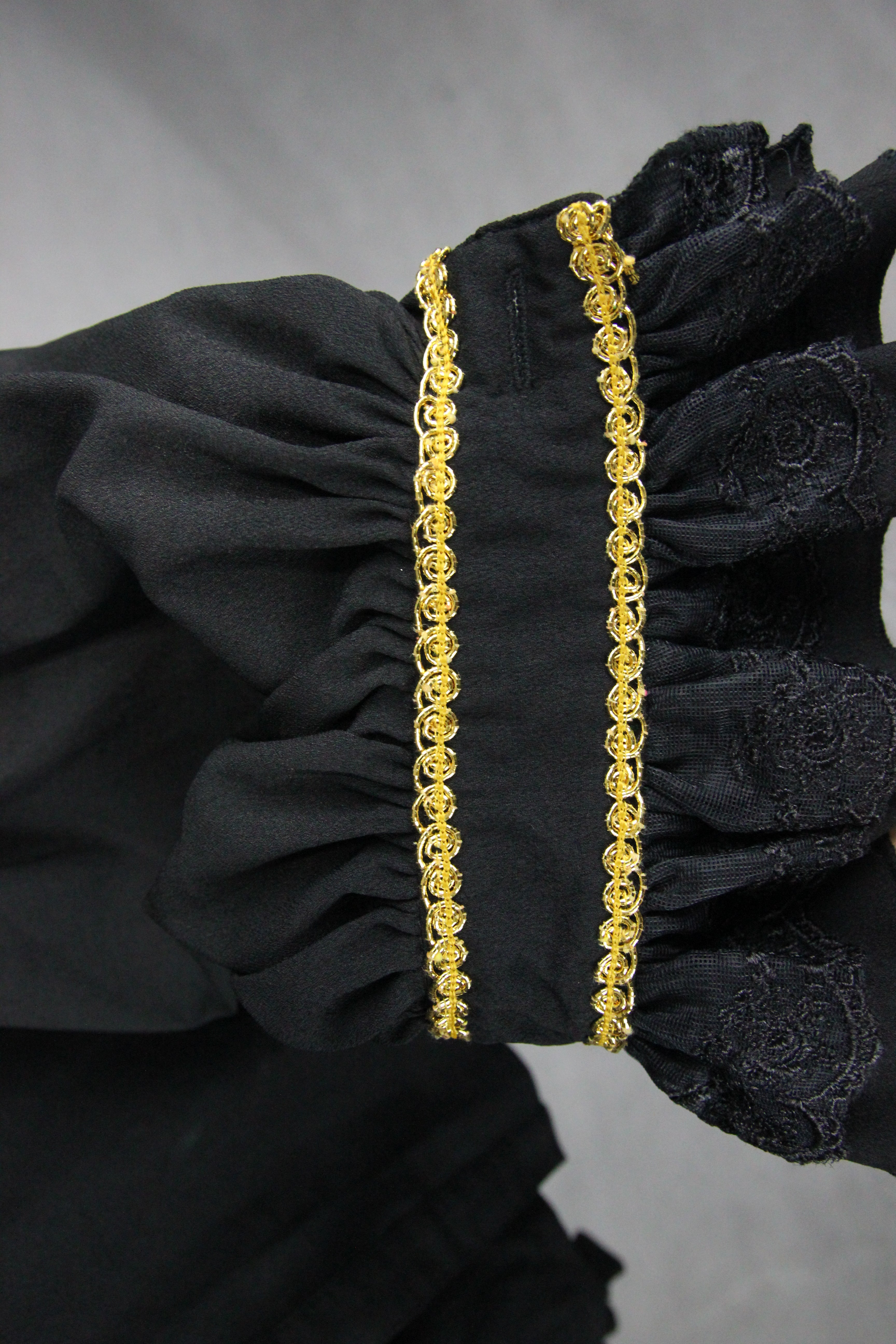 A stunning, long sleeved vampire shirt with ruffled cuffs and an impressively ornate neck piece.