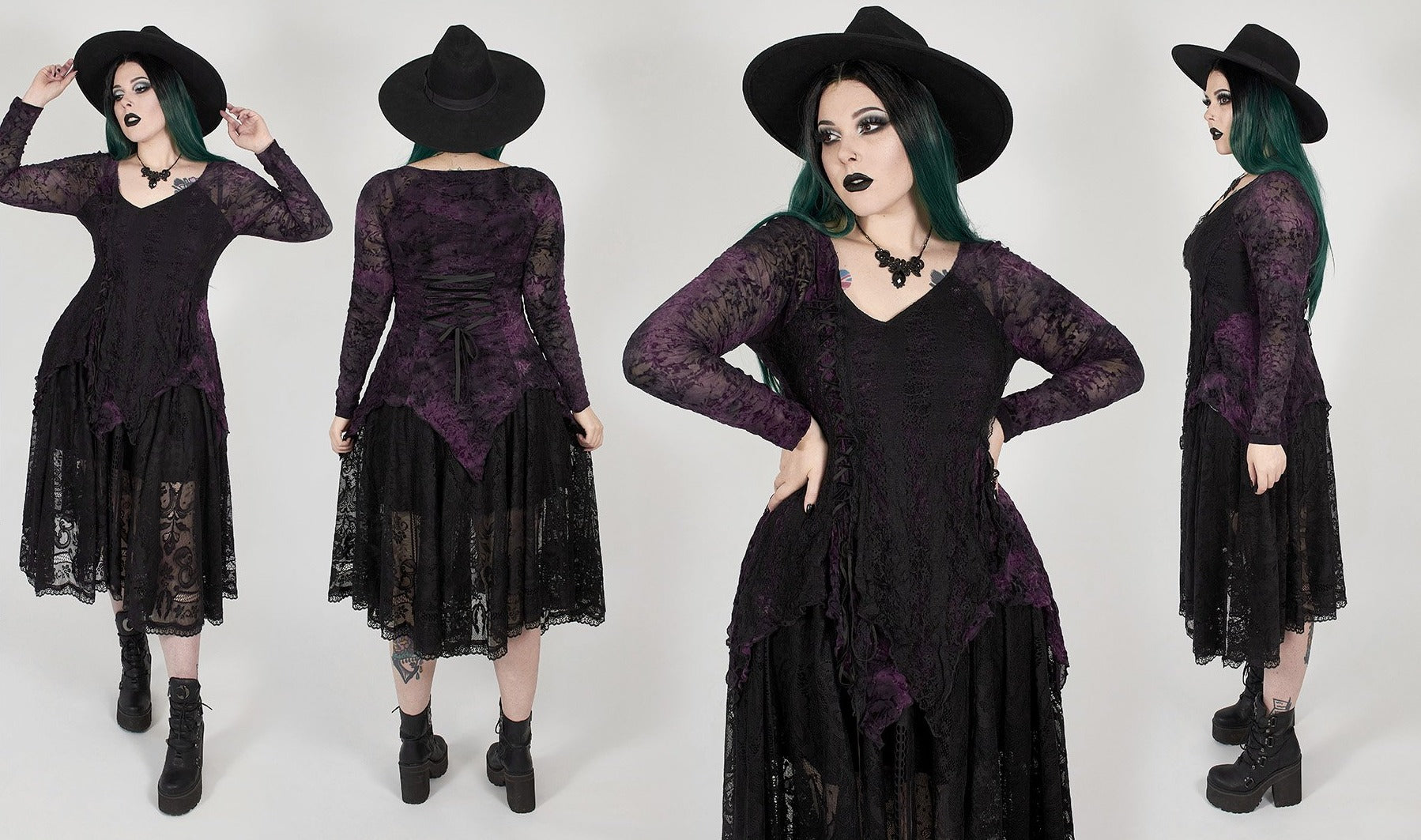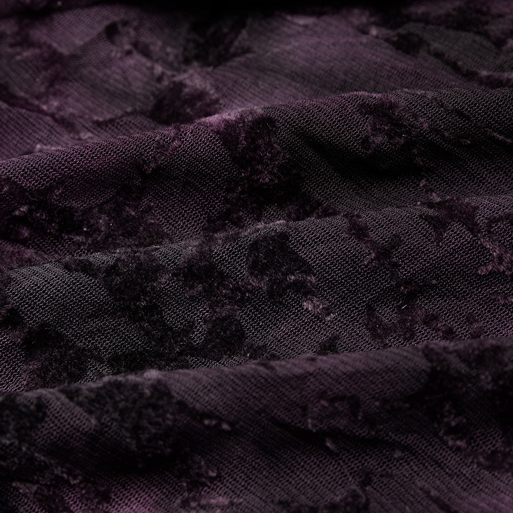 Choose from Violet with sheer rose patterned sleeves, or Black with solid fabric sleeves.