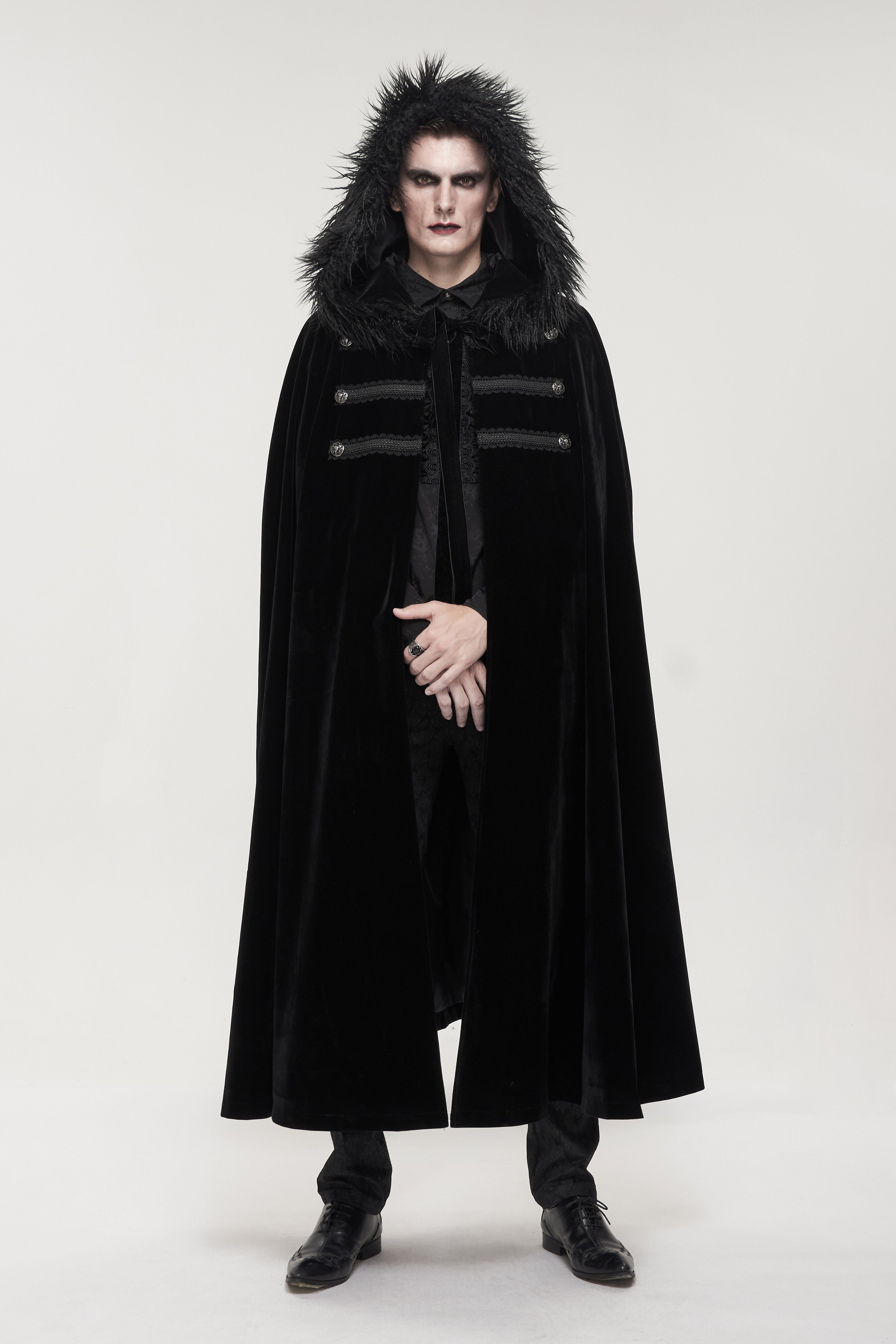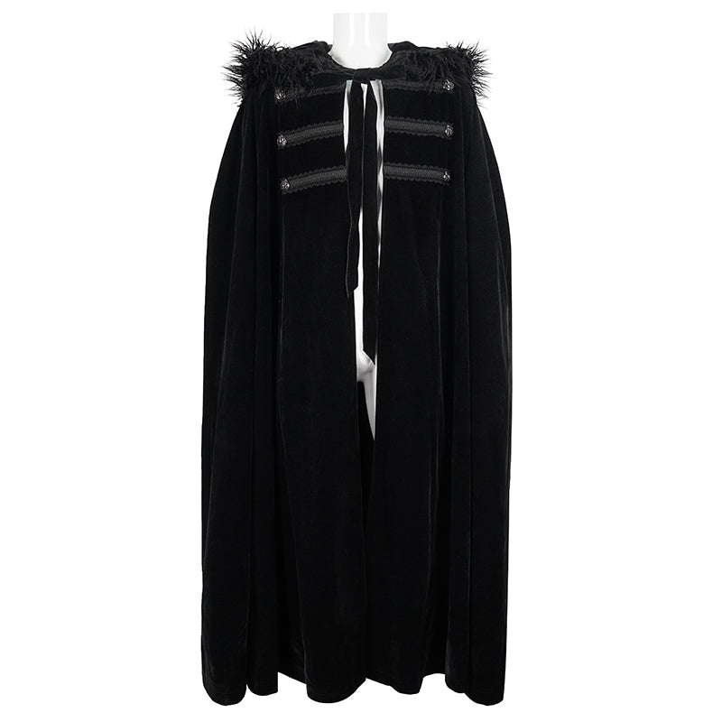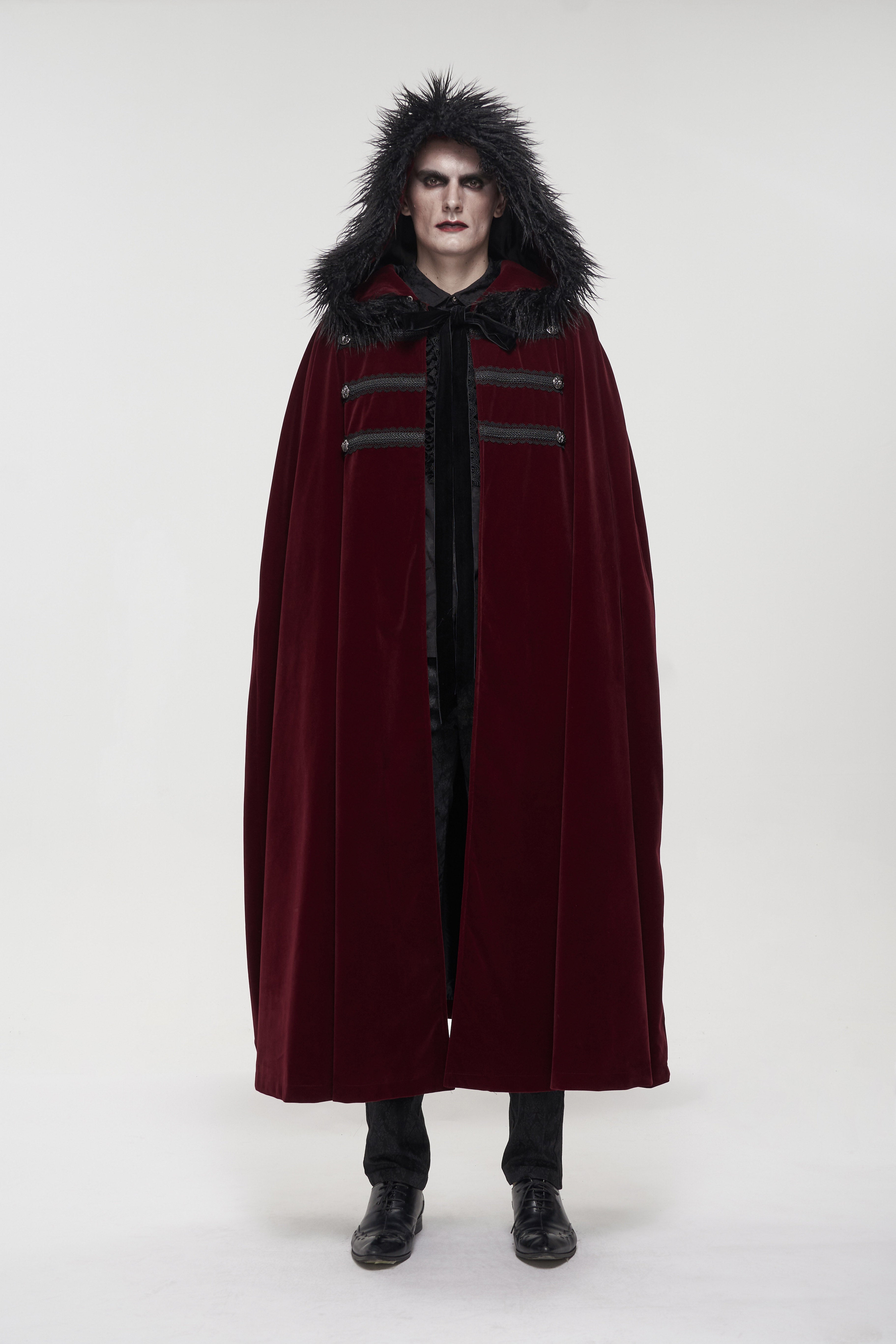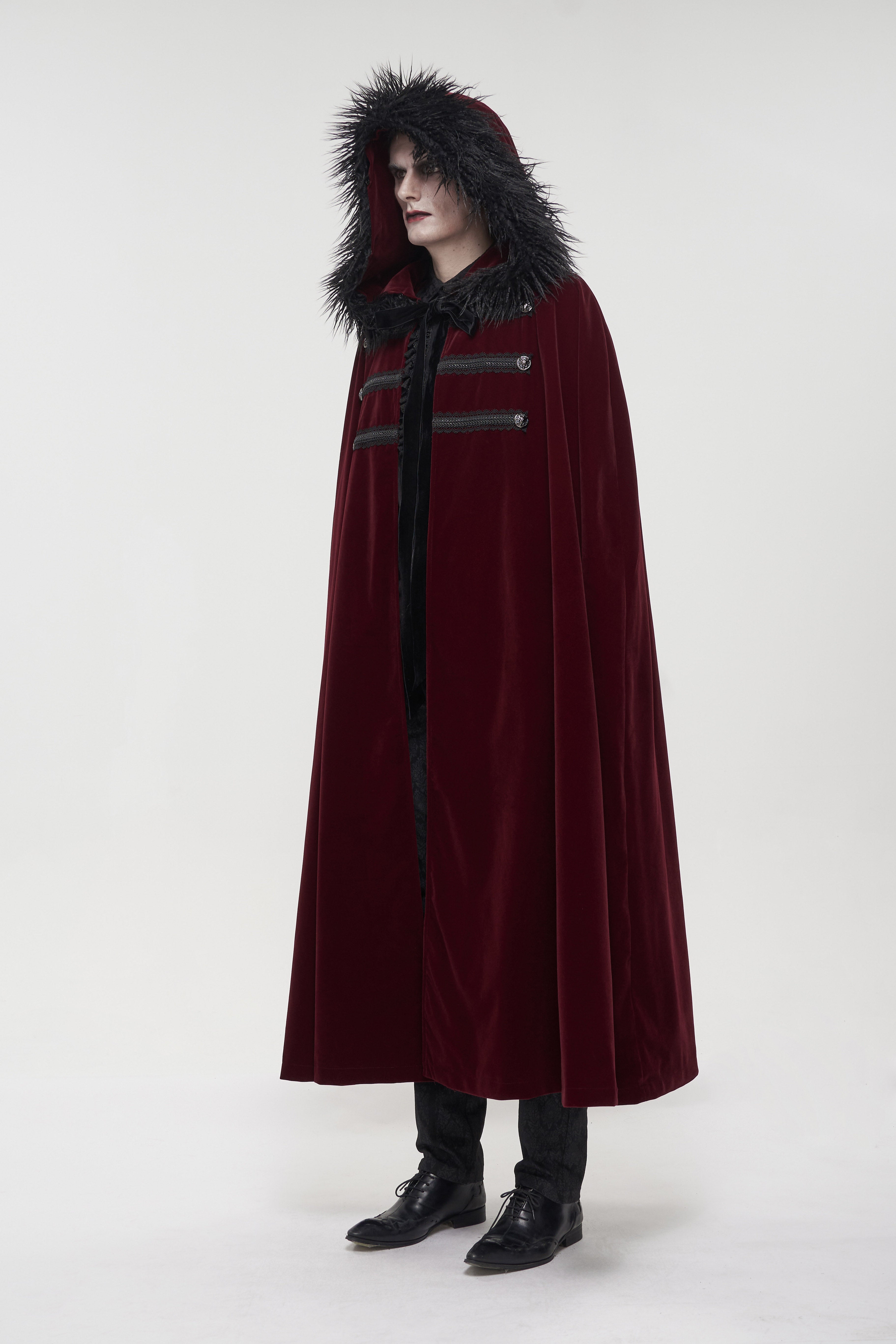 Make an entrance in this dramatic and ornate velvet cape. A black faux fur collar lines the large hood, and six goat skull embellished buttons with corresponding embroidered stripes on the chest provide stunning military vampire vibes..