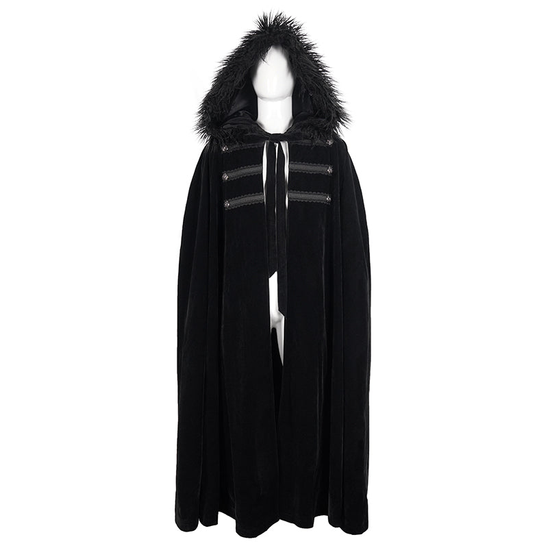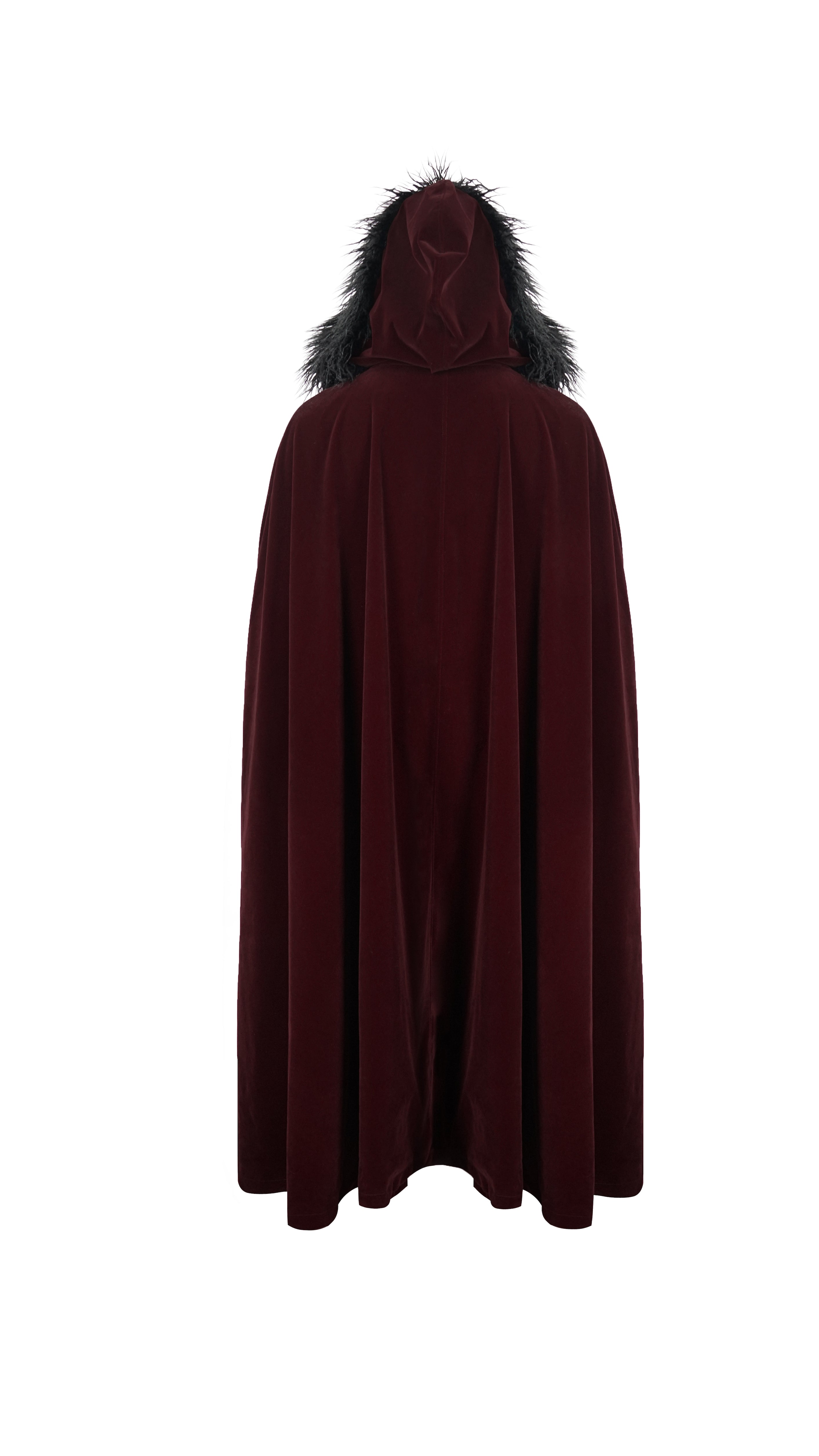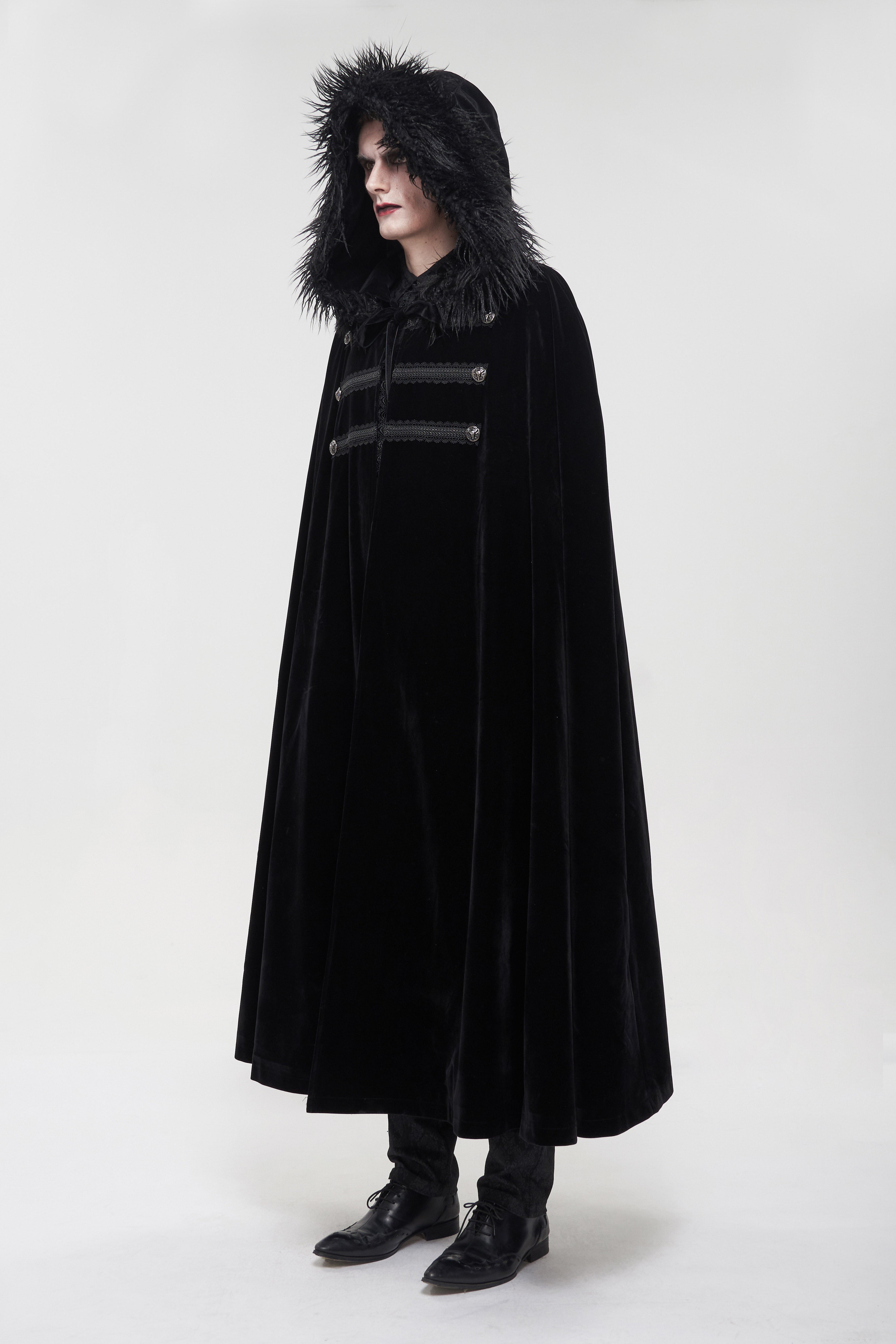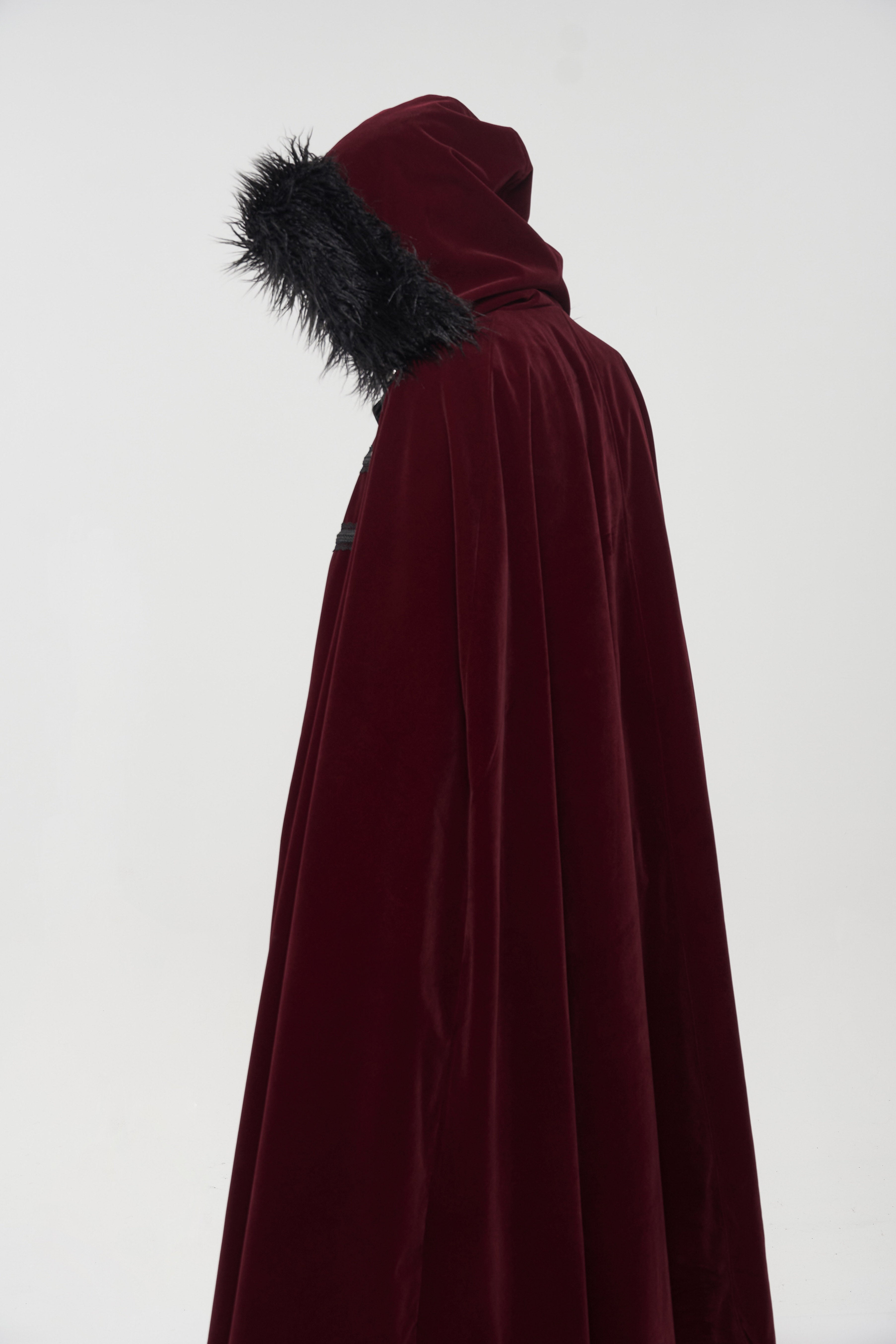 Make an entrance in this dramatic and ornate velvet cape. A black faux fur collar lines the large hood, and six goat skull embellished buttons with corresponding embroidered stripes on the chest provide stunning military vampire vibes..