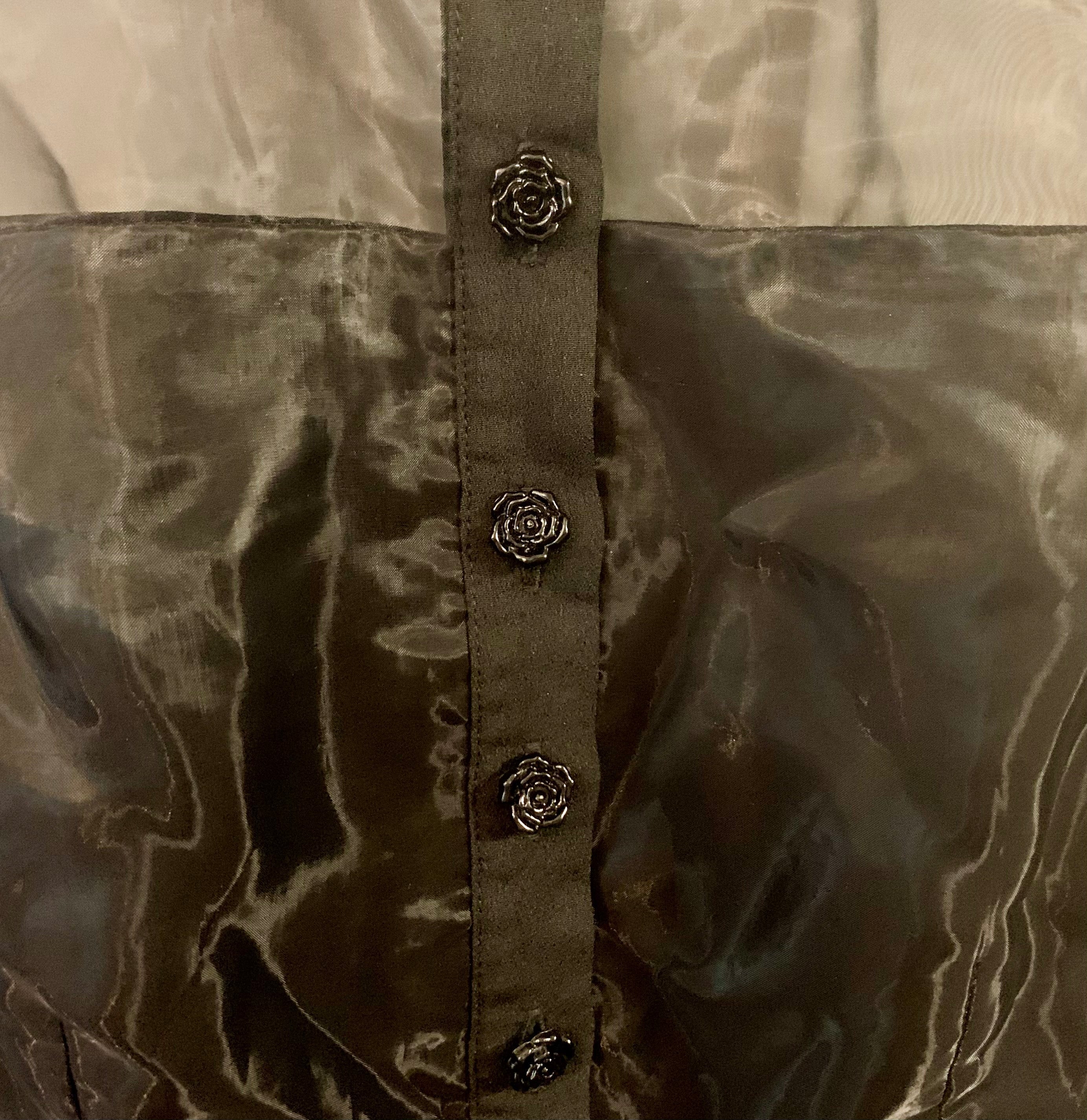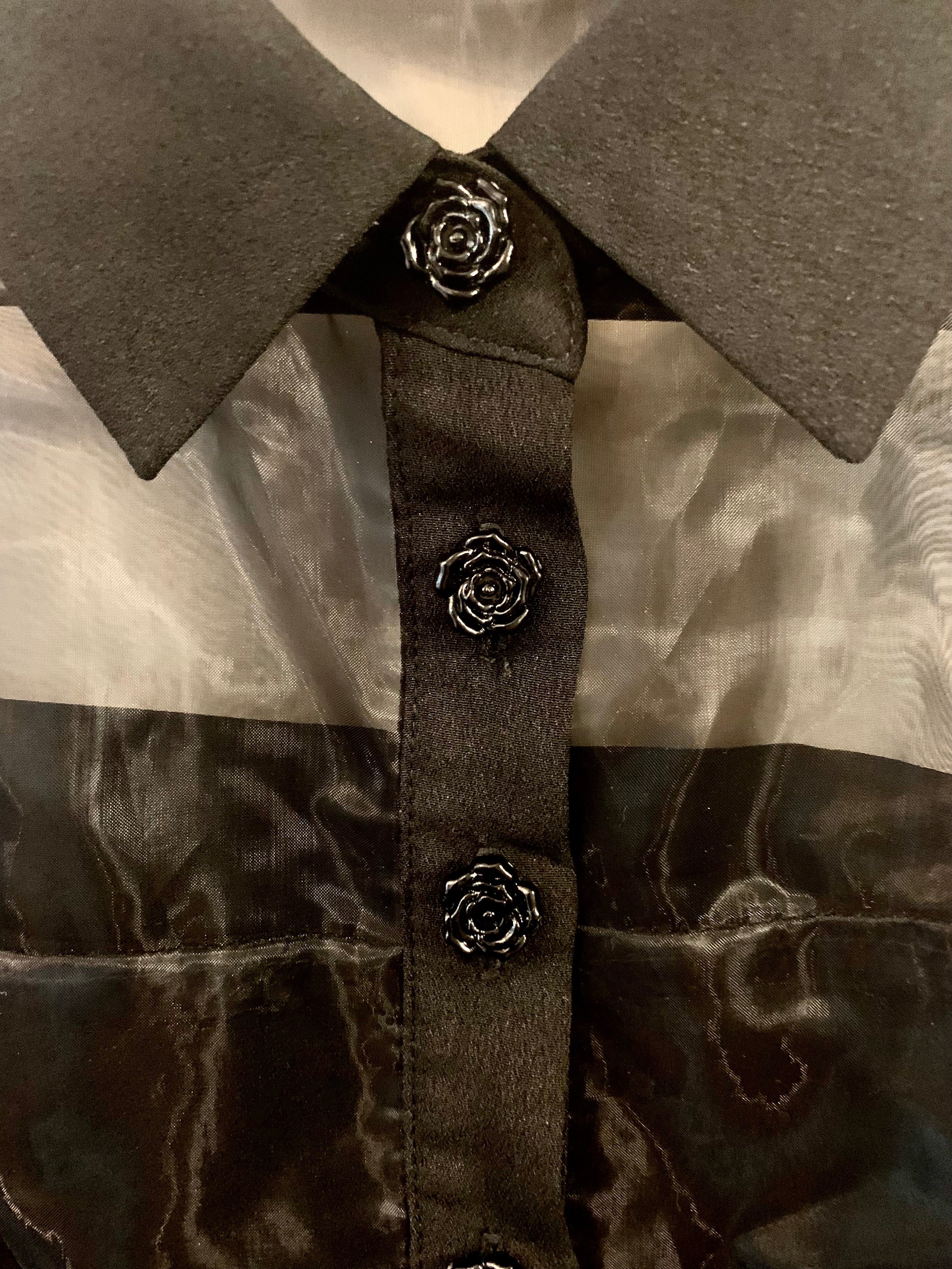 The beautiful large flared organza skirt brings sexy swing vintage vibes. Delicate black rose buttons deliver ultimate dark feminine charm, while a sheer chest and back piece ooze subtle sensuality.