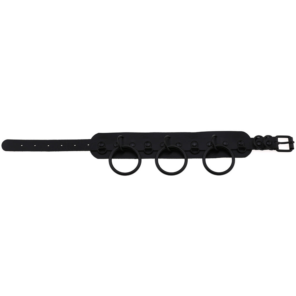 A faux leather double layer necklace collar with three large O-rings and an adjustable strap closure.